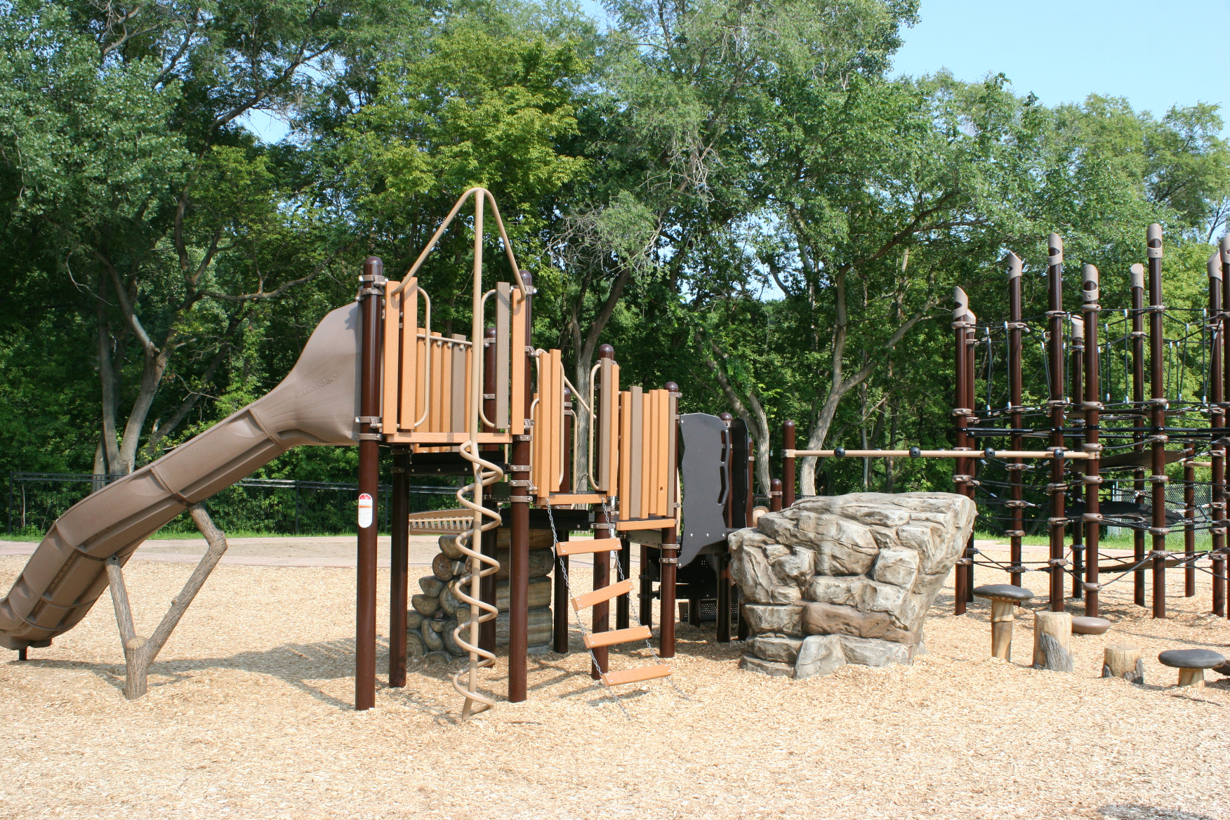 Late Friday morning we headed to Fleckenstein Bluffs Park near downtown to a playground the kids found much more to their liking. Another rock (albeit fake) to climb, a towering climbing apparatus, musical instruments, sand diggers, mini spinning seats and more, including fossils imprinted in the fake rocks.