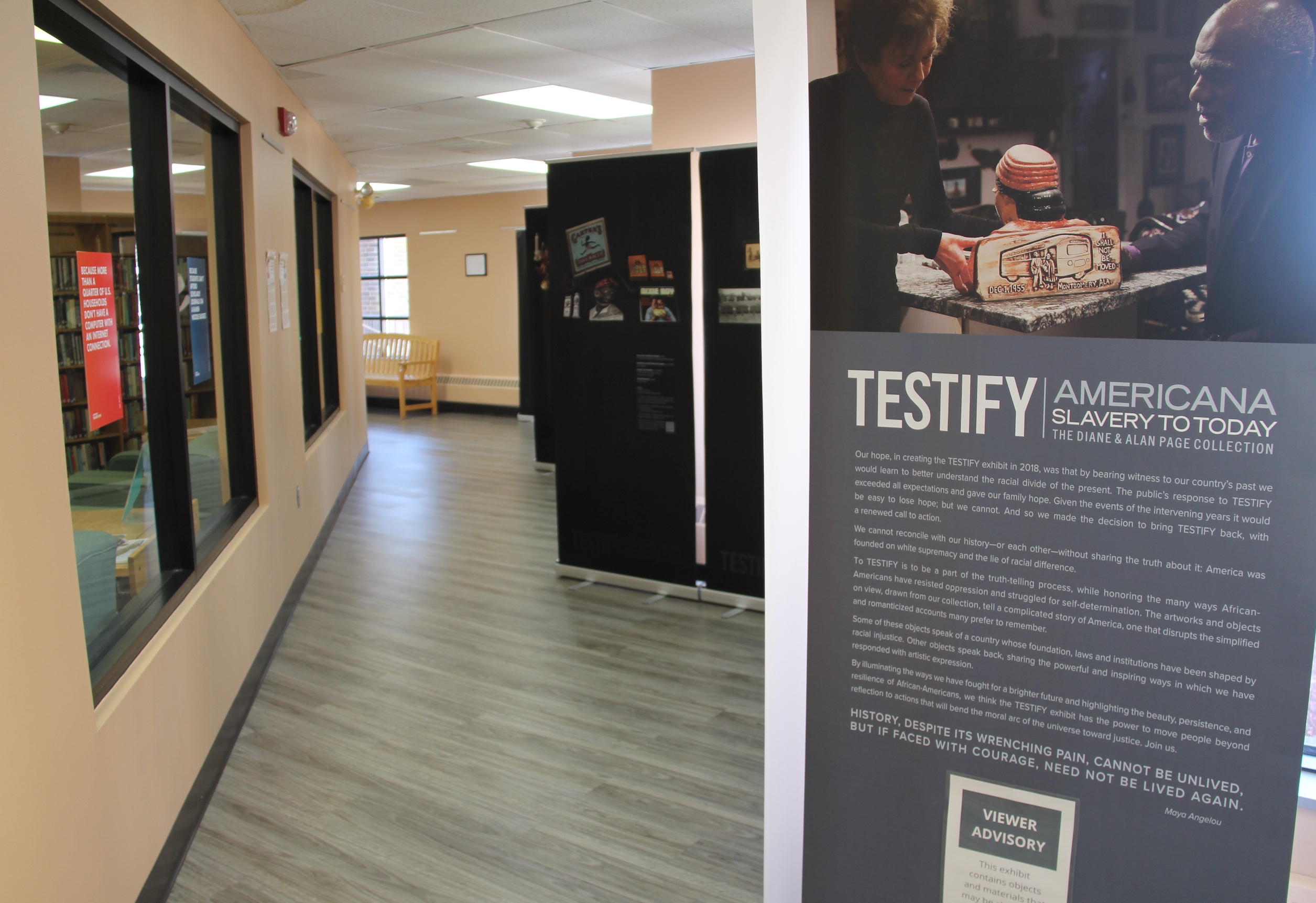 THE IMAGES AND WORDS left me feeling simultaneously unsettled, uncomfortable, disturbed, enlightened, impressed, angry and incredibly sad. My emotional reaction is not surprising after viewing the traveling exhibit, “Testify—Americana Slavery to Today,” at my local public library.