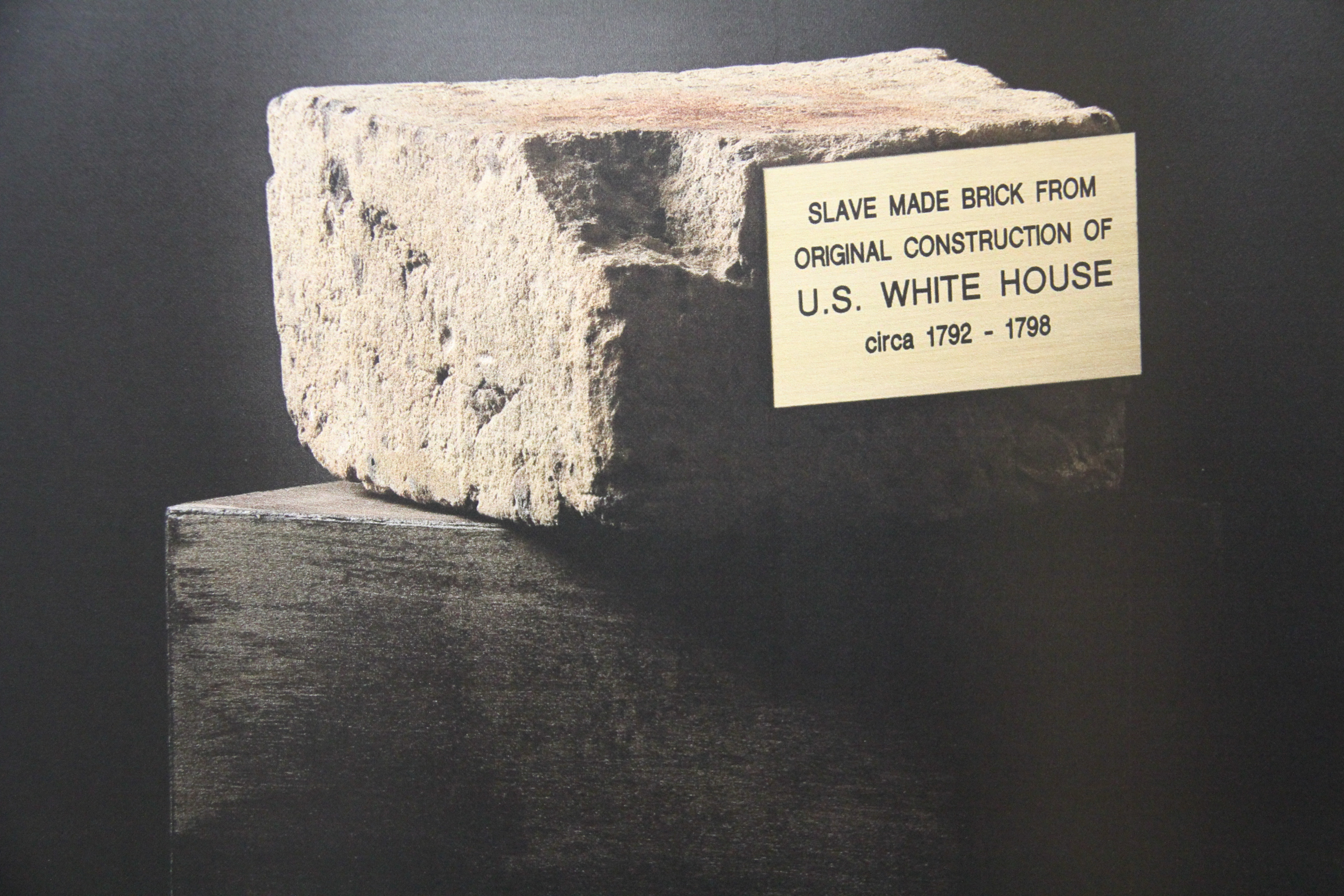 I want to backtrack for a minute to the first photo I saw in the exhibit. It was of a single brick, circa 1792-1798. This singular object drove home the point that this country was built on the backs of slaves, like those who molded and laid the bricks for government buildings in Washington DC. That includes the White House and many U.S. Capitol buildings, according to the exhibit text. Unpaid slave labor. Think about that for a minute or ten.