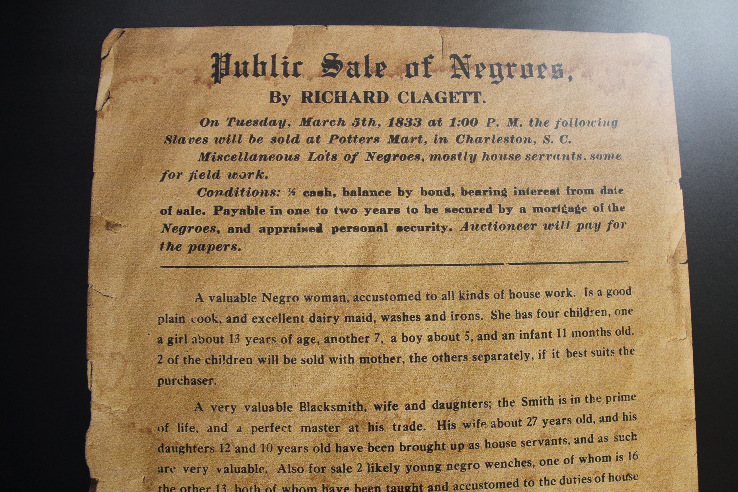 Notice of an 1833 slave auction in Charleston, South Carolina. (Minnesota Prairie Roots copyrighted photo April 2025)