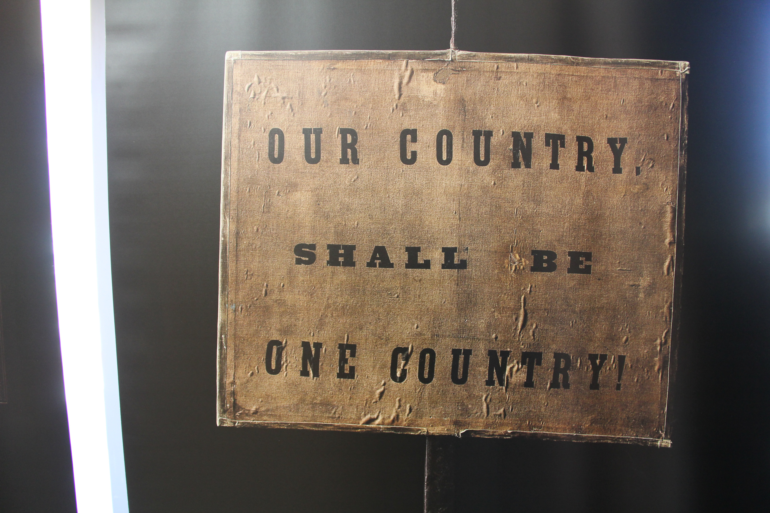This 1864 banner may have been carried by freedmen at a rally or march. During the 1864 election of Abraham Lincoln, both political parties came together to reject slavery. (Minnesota Prairie Roots copyrighted photo April 2025)