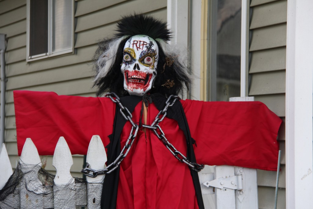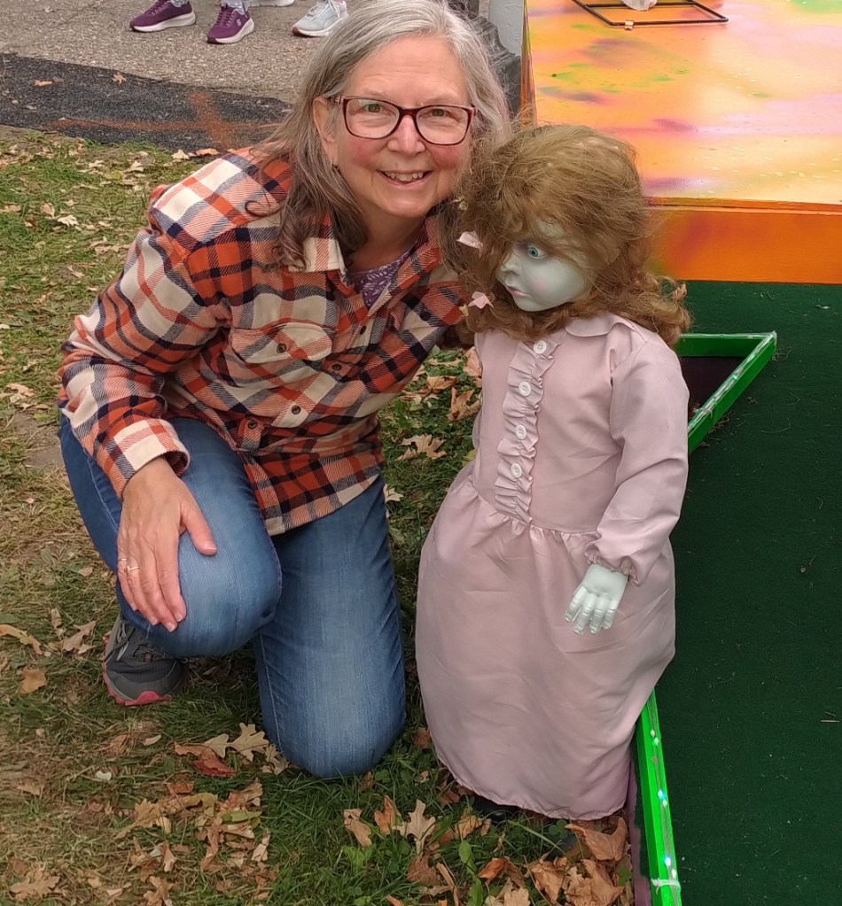 But the single freakiest Halloween decorations for me personally are the dolls. I can’t quite put my finger on why they creep me out other than that they do. My neighbors have an entire family of creepy dolls circling one hole in their mini golf course. I posed with one of them while Randy took a photo. We were there with our two oldest grandchildren during daylight hours, which likely explains why all of us were more entertained than scared.