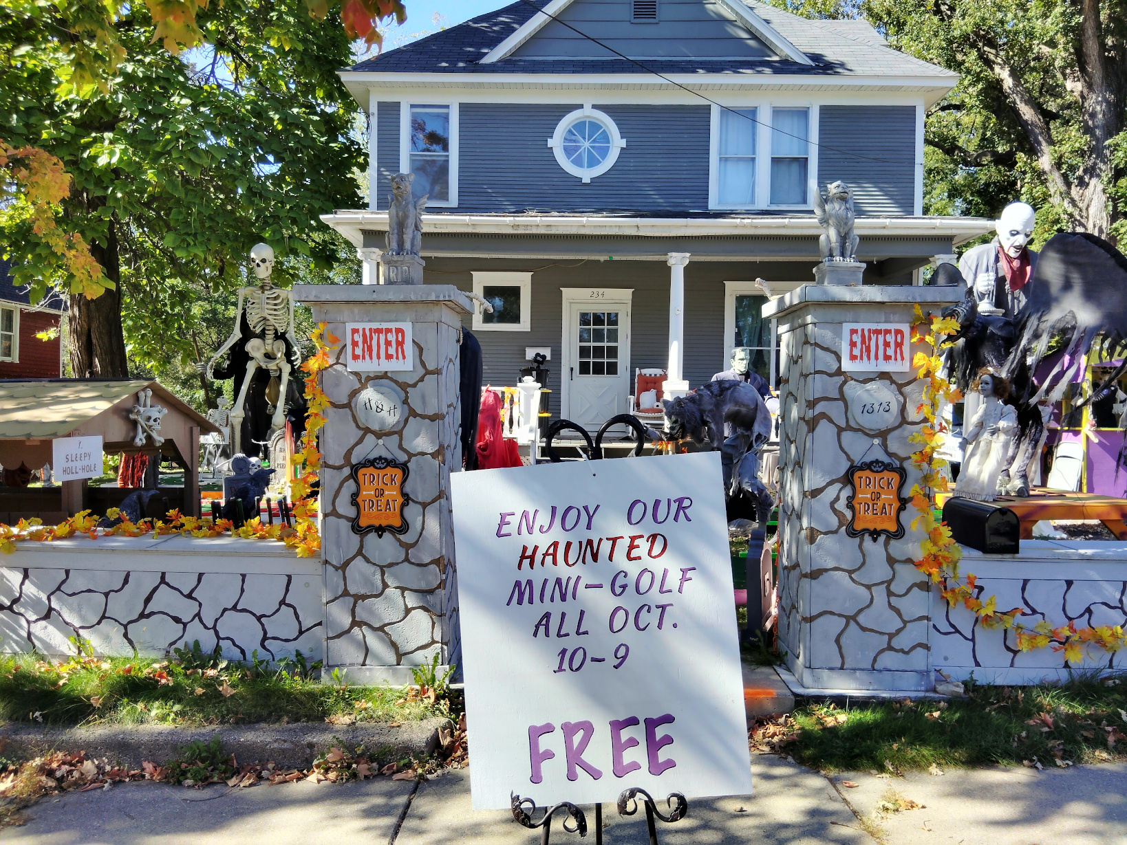 One aspect absent from my childhood Halloweens were yards full of spooky decorations. Today they are everywhere. My neighbors up the street, Coy and Kathy Lane, create a themed display in their yard that is open from 10 a.m.- 9 p.m. the entire month of October. This year they built a haunted mini golf course. It’s impressive. Sound, lights and action make this a fully-immersive experience created by a couple who clearly love Halloween. They’ll be handing out full-sized candy bars on Halloween, the final date the display is open to the public…until next October.