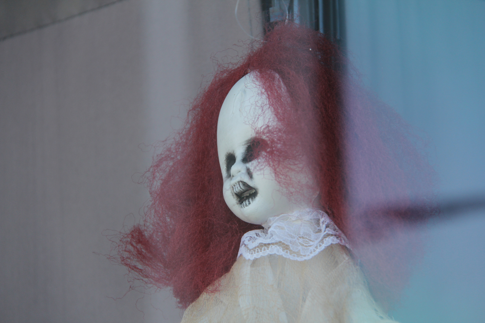 But the single freakiest Halloween decorations for me personally are the dolls. I can’t quite put my finger on why they creep me out other than that they do. My neighbors have an entire family of creepy dolls circling one hole in their mini golf course. I posed with one of them while Randy took a photo. We were there with our two oldest grandchildren during daylight hours, which likely explains why all of us were more entertained than scared.