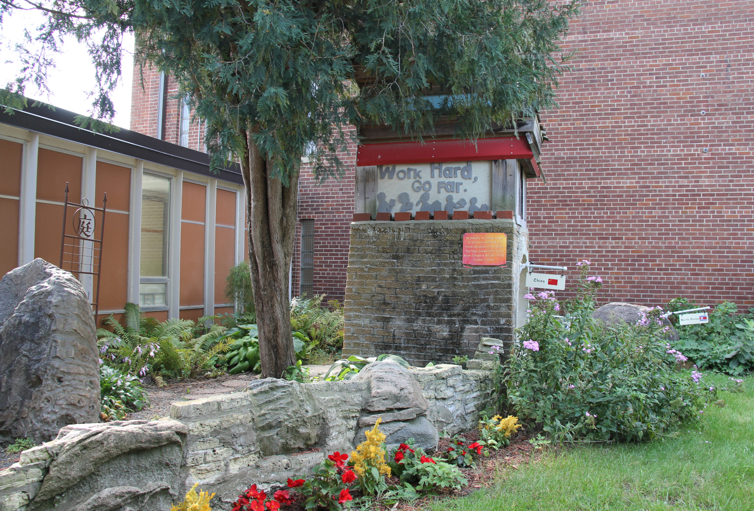 Lovely landscaping, flowers and plants surround the art honoring China with an inspiring message. (Minnesota Prairie Roots copyrighted photo September 2025)