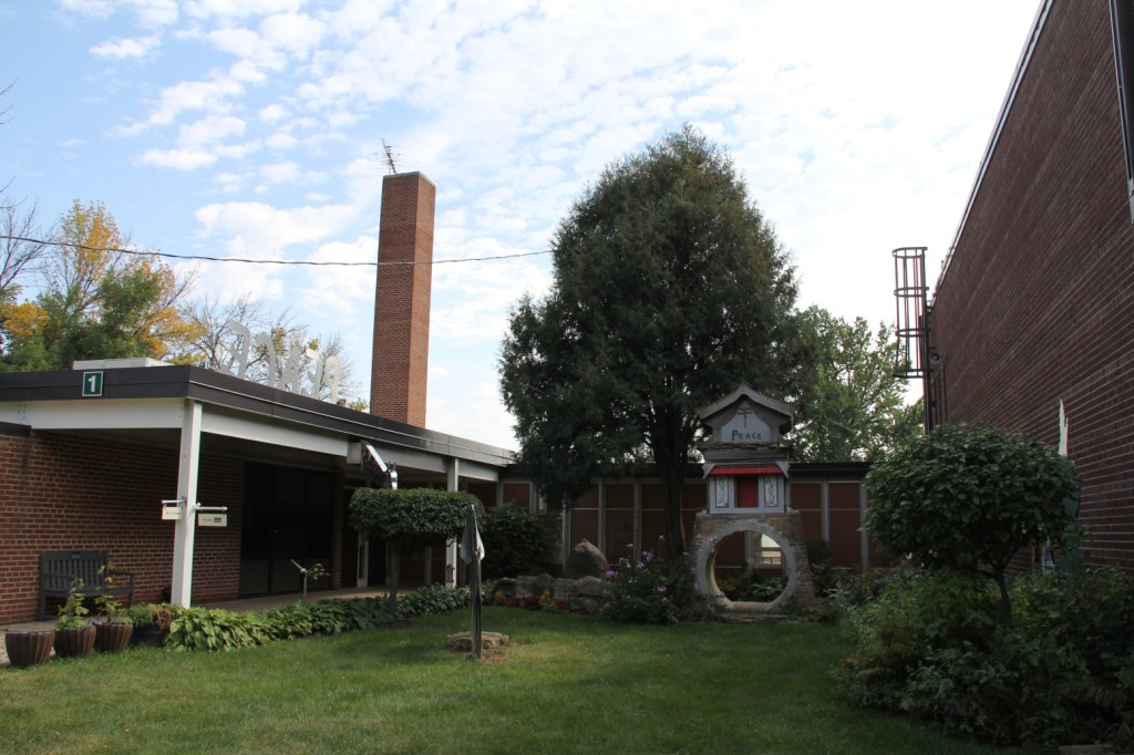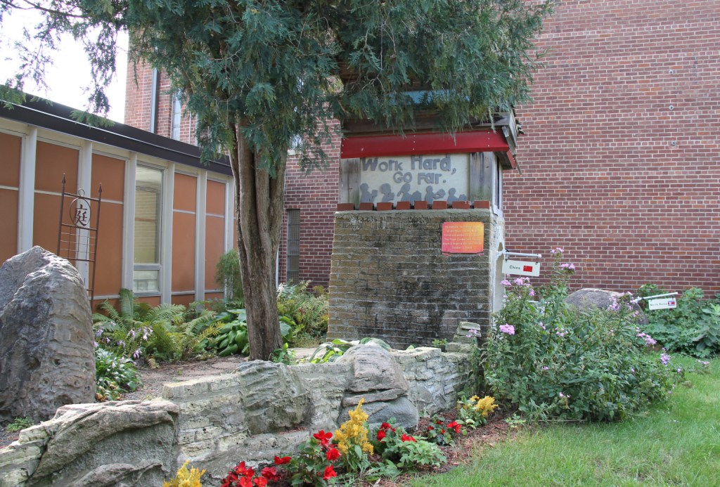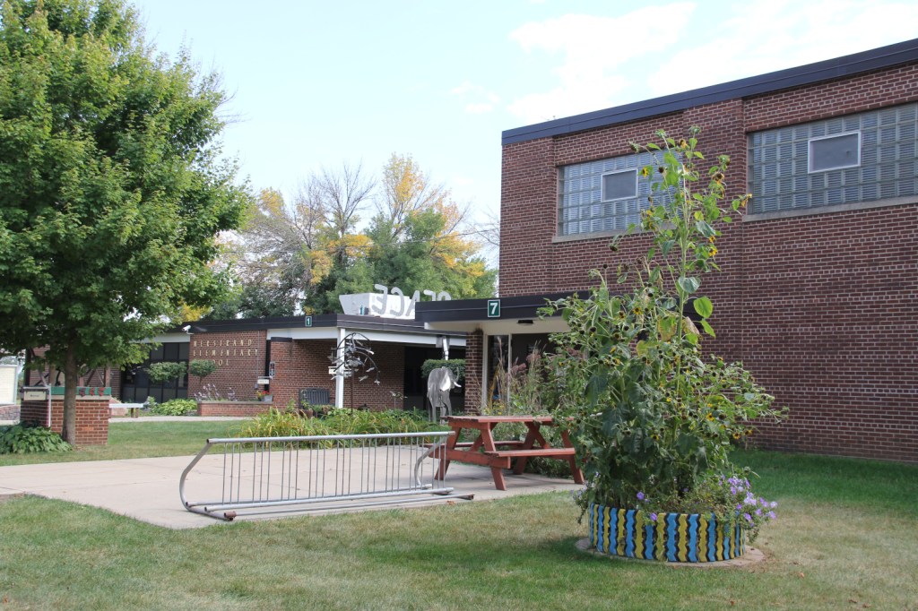 This green space centers the Peace Garden outside the school entry. (Minnesota Prairie Roots copyrighted photo September 2025)