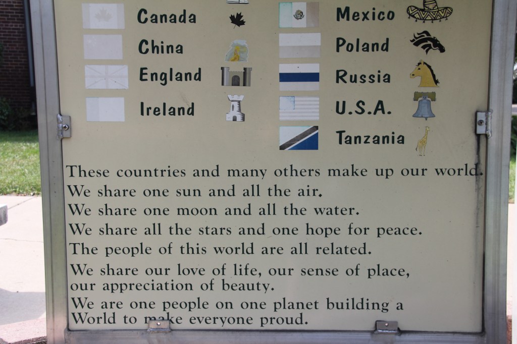 Signage at the garden emphasizes that we all live under the same sun and moon on the same planet. We are all connected and all part of building a world “to make everyone proud.” That includes the U.S., Russia, China, Mexico, Canada… This is not a political message posted outside this small town Minnesota elementary school. Rather, this is a simple statement about those of us who call planet Earth our home.