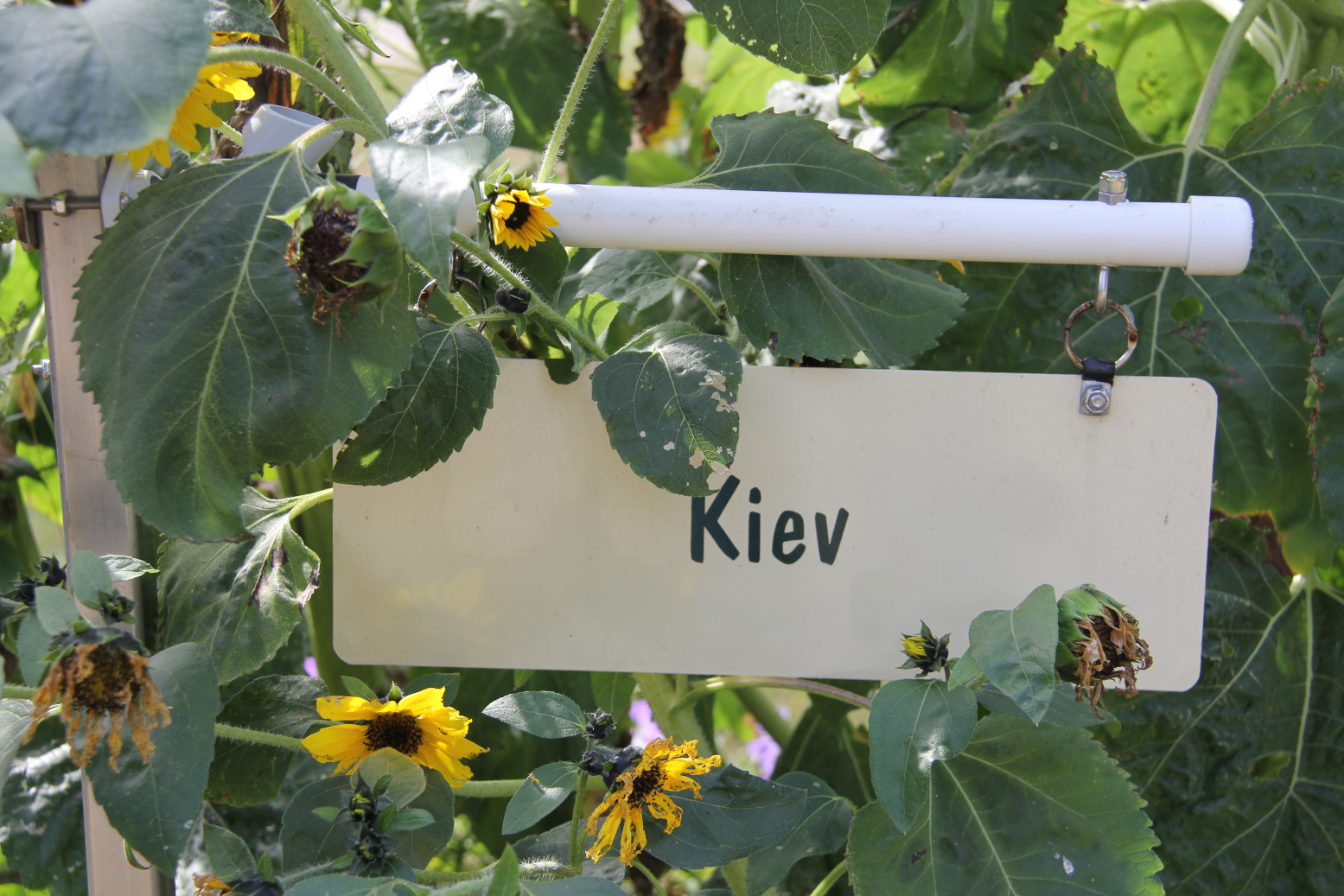 Sunflowers grow around a sign naming Ukraine’s capital city. (Minnesota Prairie Roots copyrighted photo September 2025)