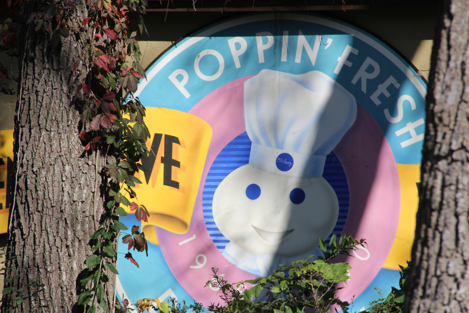 The iconic Pillsbury Doughboy on signage in small town southern Minnesota. (Minnesota Prairie Roots copyrighted photo September 2025)