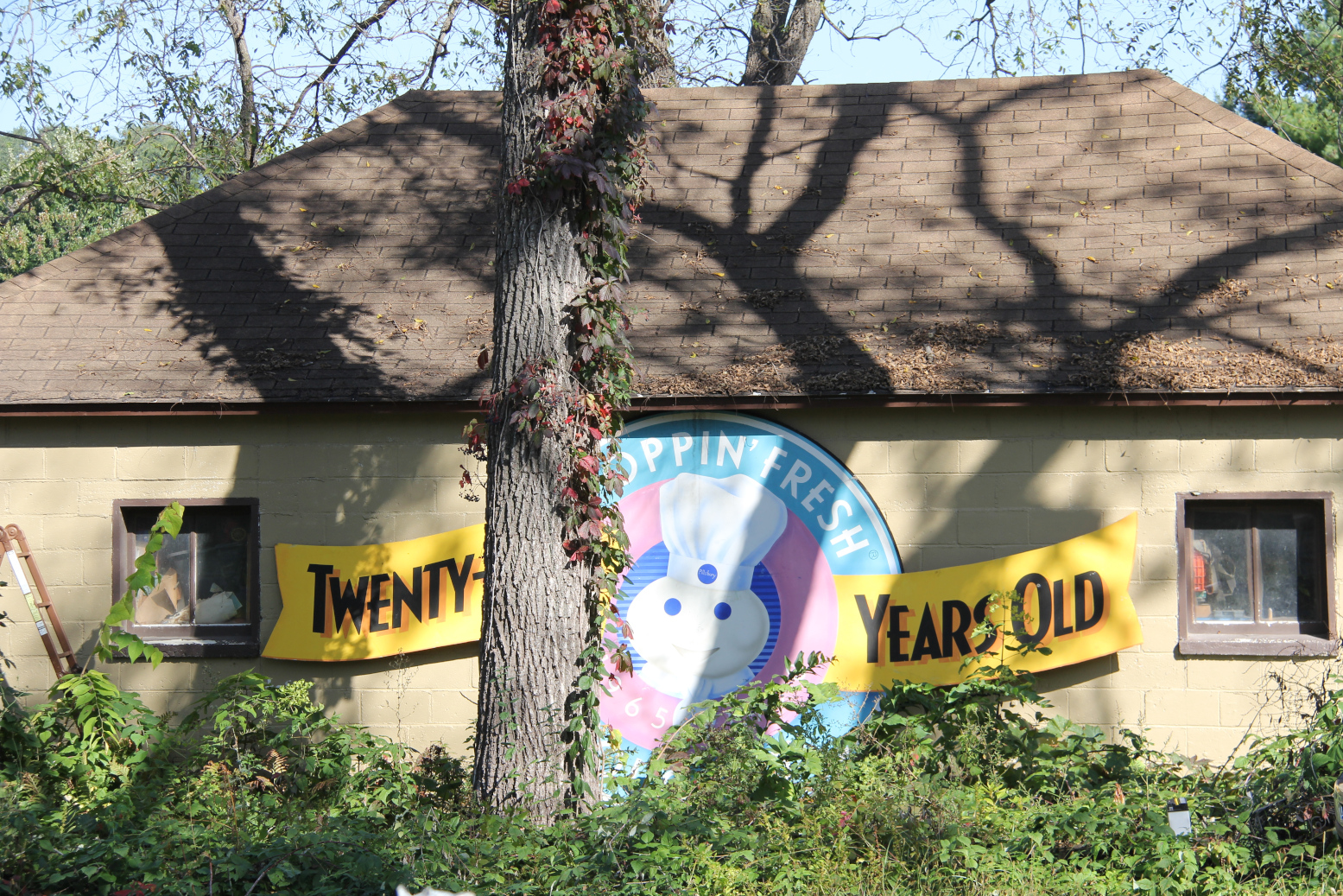 Now days later, when I really need a second dose of laughter, I remember photos I took in small town Dennison several months ago. They are of a Pillsbury Doughboy sign leaning against a shed along the main highway that runs through this southern Minnesota community.