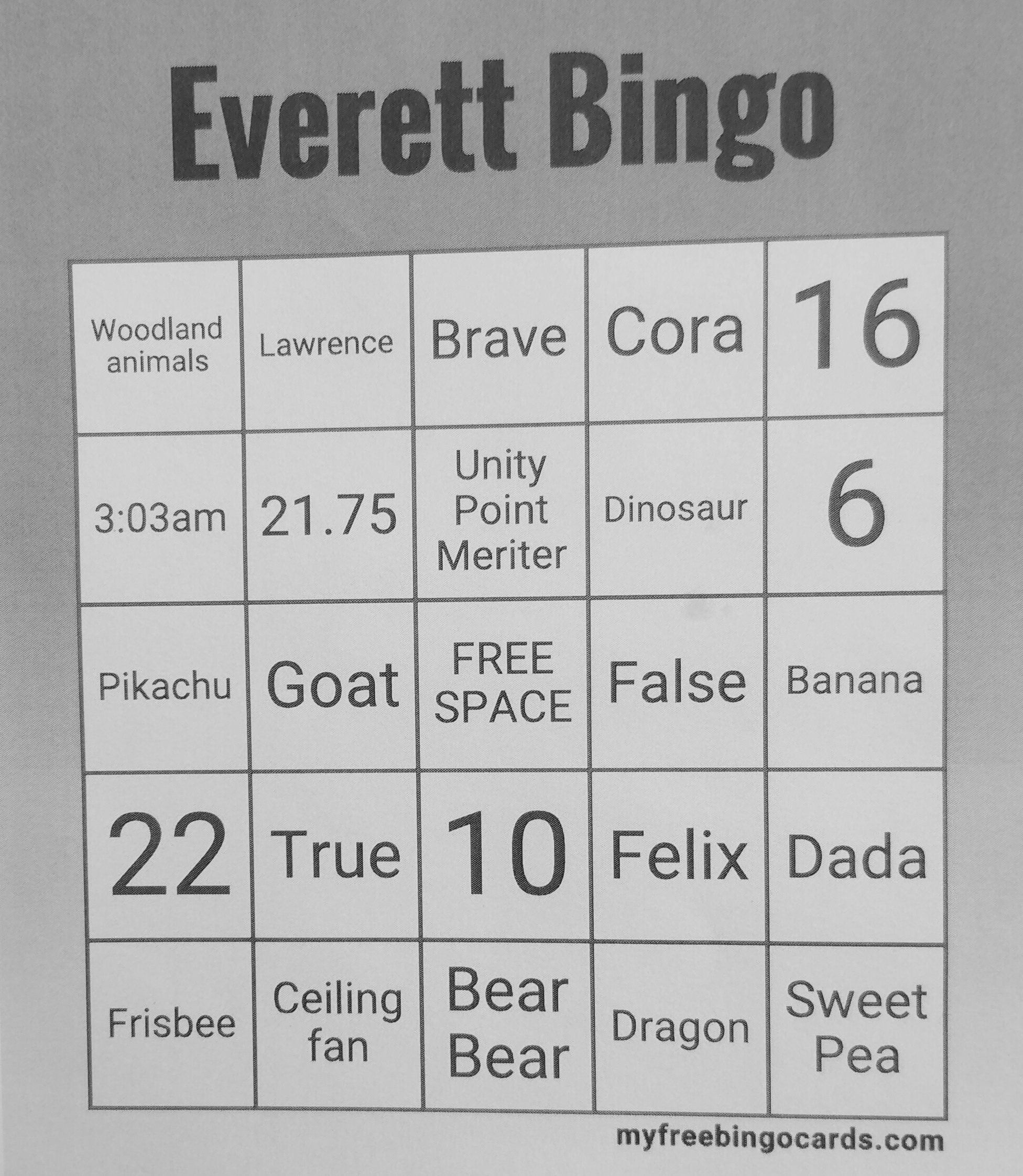 It was a joy-filled afternoon for all nine of us gathered on a cold January afternoon in eastern Wisconsin to celebrate Everett. We laughed, took lots of photos of the birthday boy while he ate his cake and sort of opened gifts. We played Everett BINGO, a customized game that tested our knowledge of the birthday boy. He could have been a Felix or a Cora. Ceiling fans once mesmerized him. His favorite Pokemon is Pikachu, according to his two young Minnesota cousins.