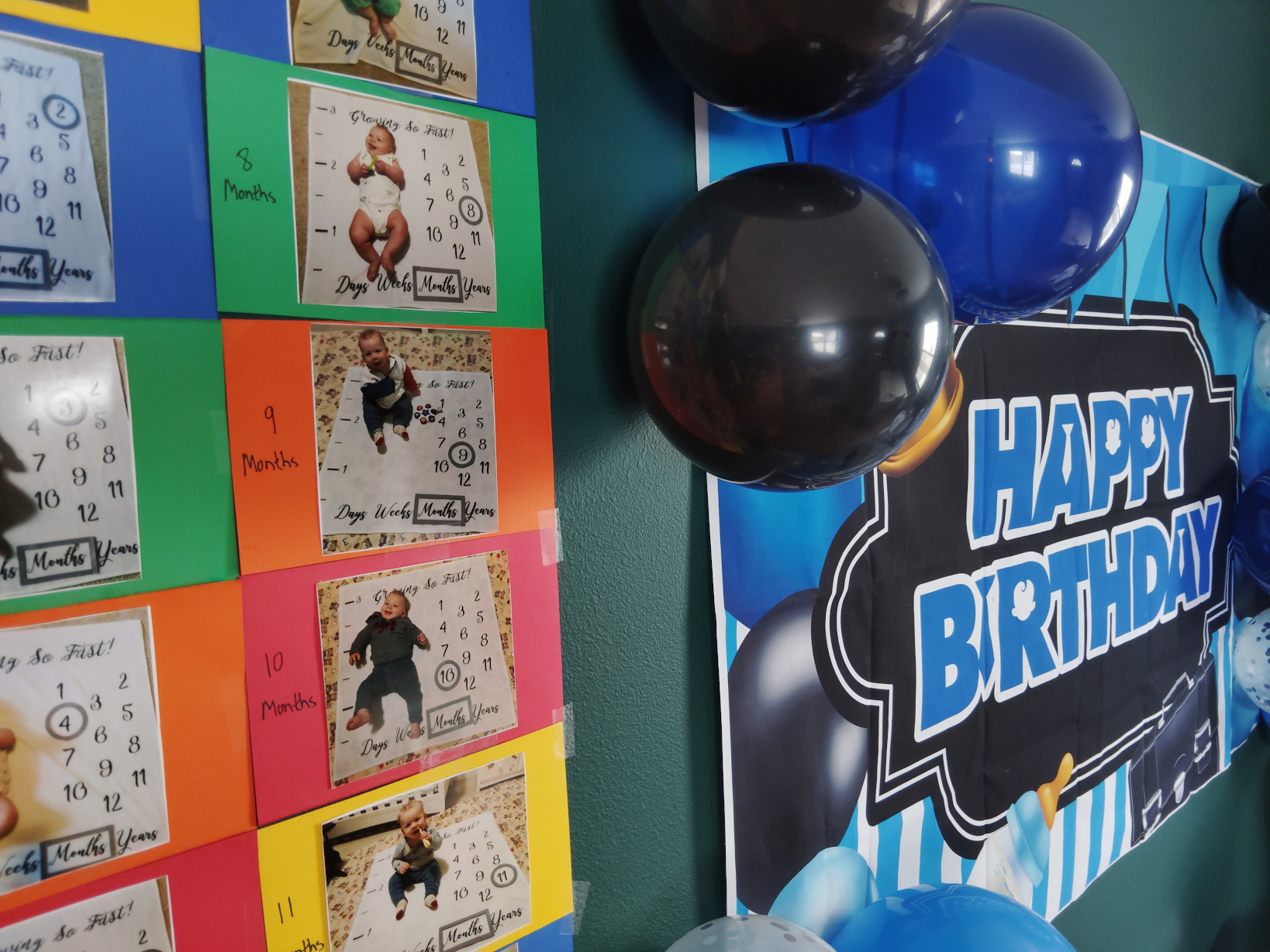 Next to Everett’s birthday banner, his mama hung photos she took each month to document his growth during his first year of life. (Minnesota Prairie Roots copyrighted photo January 2026)