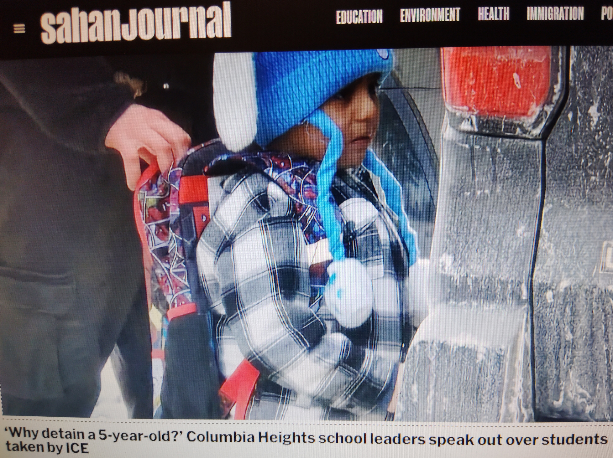 From Sahan Journal, coverage of ICE apprehension of a 5-year-old in a northern suburb of Minneapolis. The photo was shared with the media by the Columbia Heights Public School.