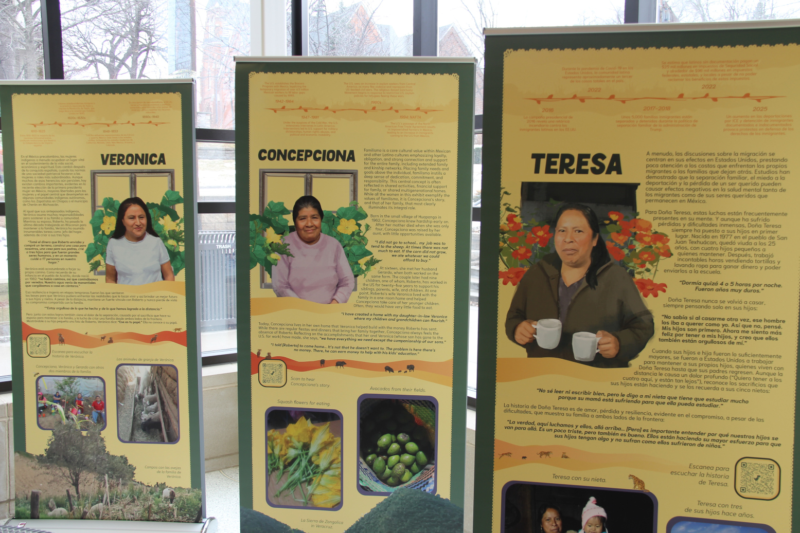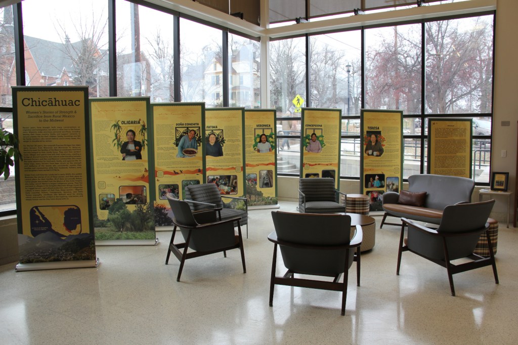 The stories of six women from Mexico are featured on these panels in a traveling exhibit in the atrium of the Northfield Public Library. (Minnesota Prairie Roots copyrighted photo January 2026)