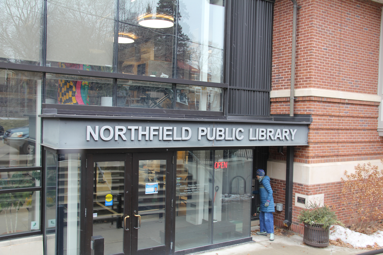 The atrium side/lower level entry to the Northfield Public Library. (Minnesota Prairie Roots copyrighted photo January 2026)