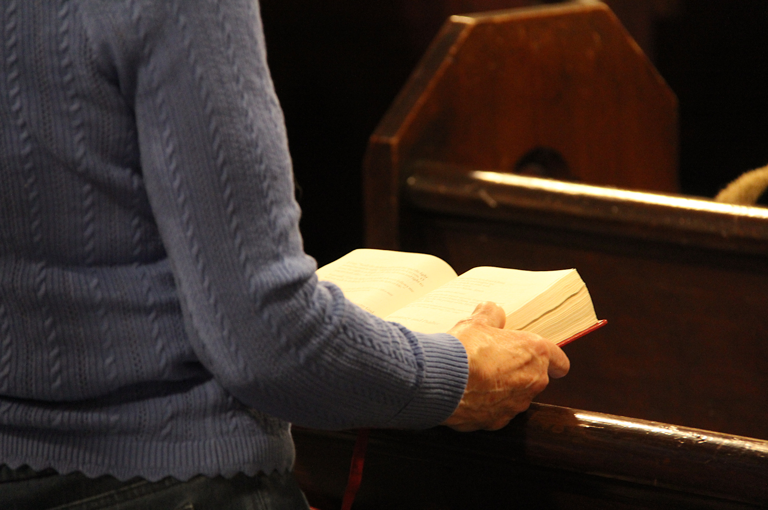 A woman holds a prayer book used often during the service. (Minnesota Prairie Roots copyrighted photo February 2026)