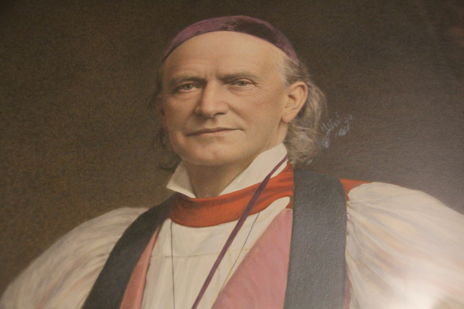 A portrait of Bishop Henry Whipple hanging inside the cathedral. (Minnesota Prairie Roots copyrighted photo February 2026)