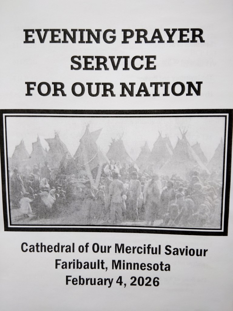 WE GATHERED. On a day when I learned that a friend, an American citizen, was recently racially-profiled and stopped by ICE. On a day when I learned that ICE vehicles have been parked in my neighborhood. On a day when several Minnesota children were released from federal detainment in Texas. On a day when the border czar announced the draw-down of 700 federal agents (out of 3,000) in Minnesota. On this early February day, 75 of us gathered for an “Evening Prayer Service for Our Nation” at the Cathedral of Our Merciful Saviour in Faribault, Bishop Henry Whipple’s church.
