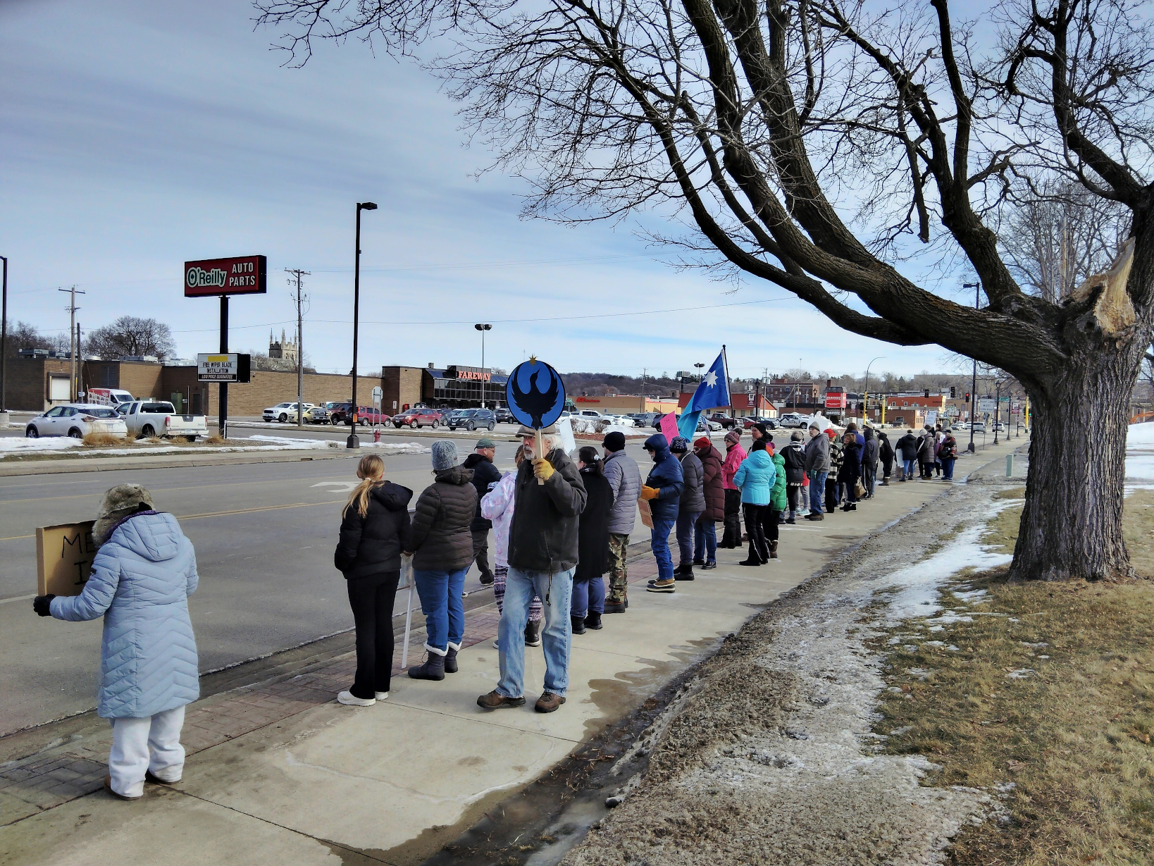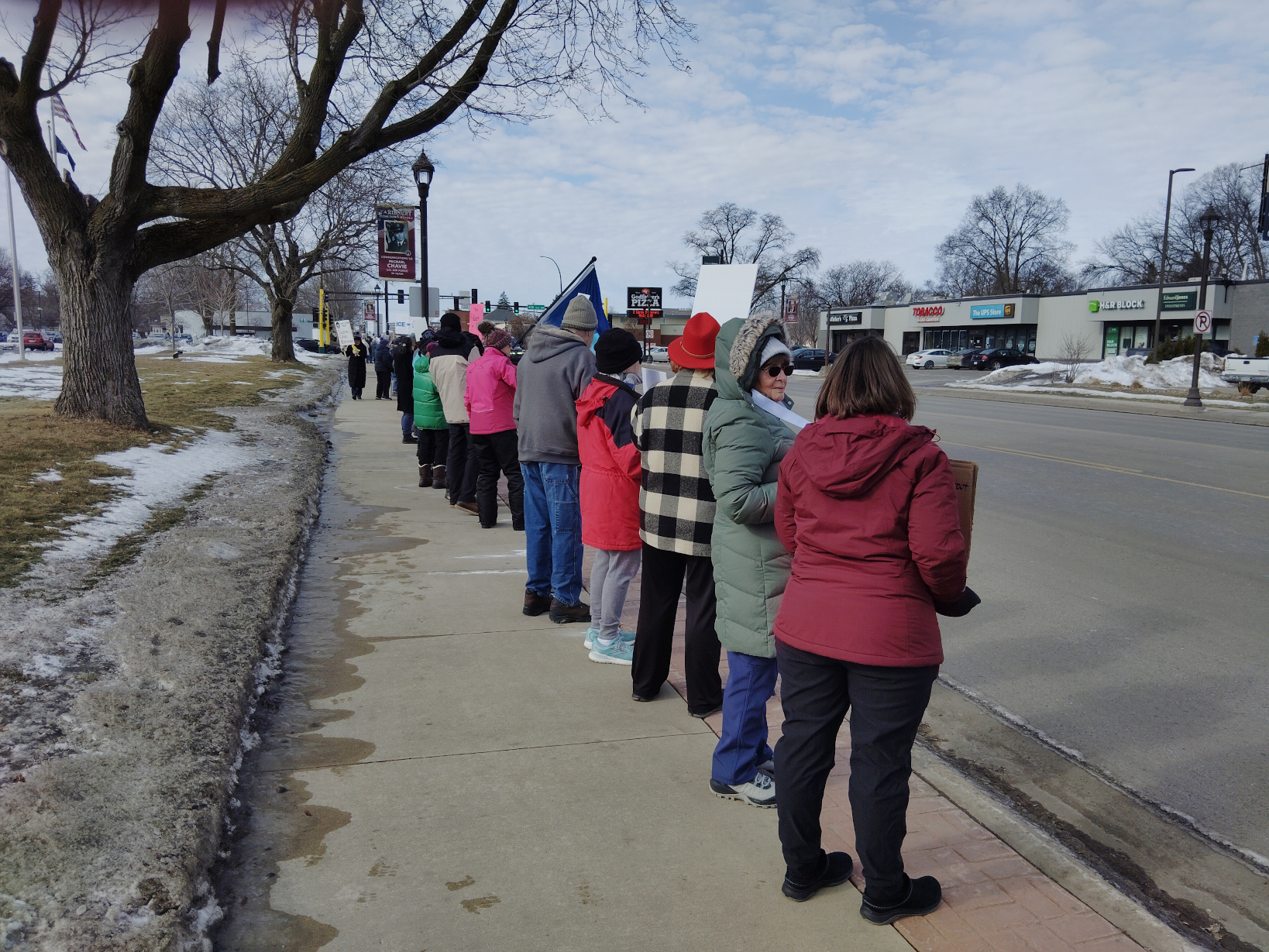 Just before 11 a.m. Saturday, Randy and I joined others outside the Rice County government services building along Minnesota State Highway 60 for our fourth protest there and the fifth in Faribault. Each week numbers grow, this time reaching some 80 of us stretched along the sidewalk with our signs.