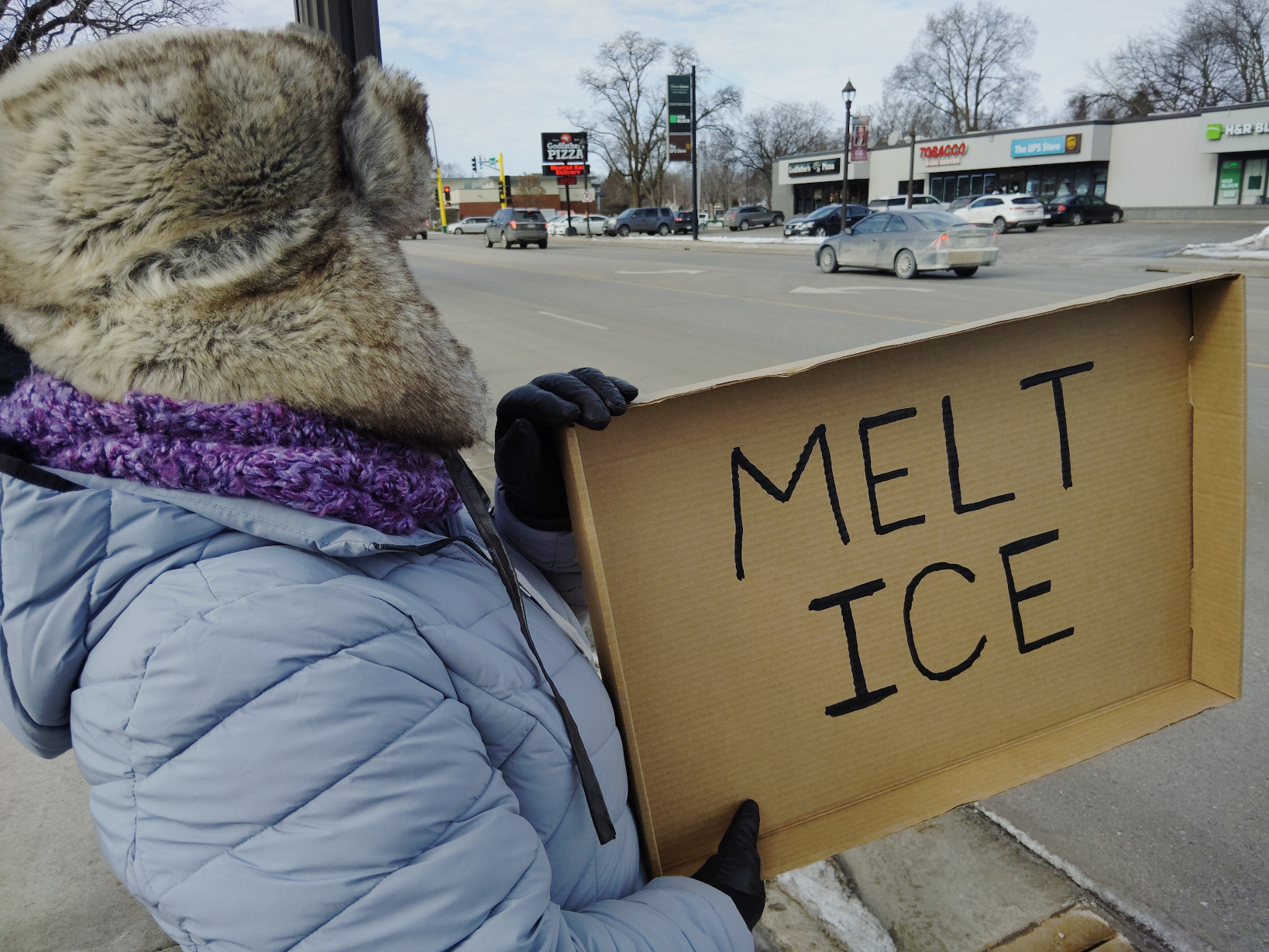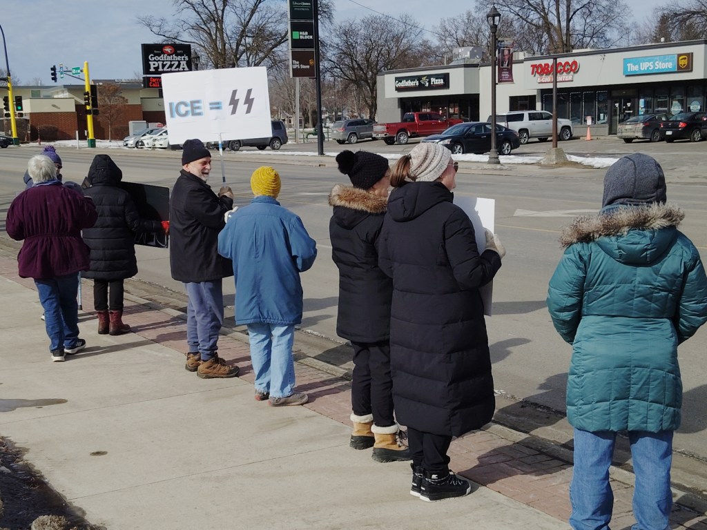 And so we protest, week after week in our community an hour south of Minneapolis, because our city, too, has been impacted by ICE. People have been taken by federal agents from an apartment complex near the public library, by the railroad tracks near the turkey processing plant, from the trailer parks… It’s documented in videos. Warning horns blare, whistles sound, bystanders yell, sometimes. ICE has parked for hours in a neighborhood with Hispanic families. Watching, intimidating, silently threatening. Agents have photographed license plates at a gas station. This is reality in my city of 25,000.