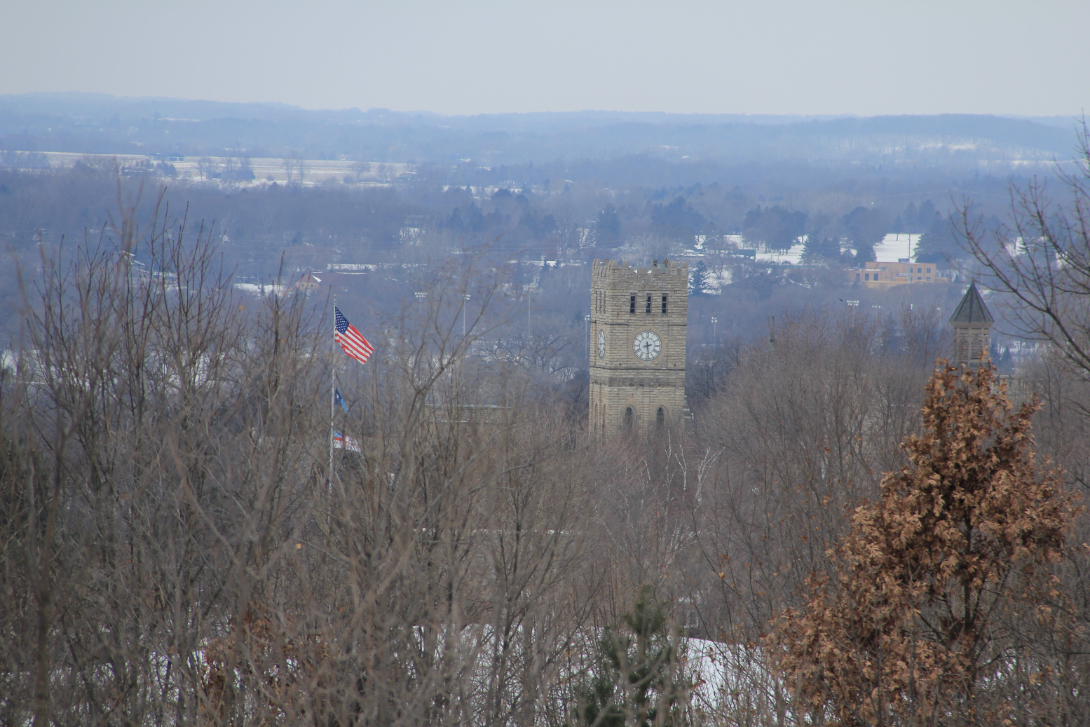 I consider this park one of Faribault’s best kept secrets. It provides a sweeping view of the valley with local landmarks poking through the landscape. Like the clock tower on Shumway Hall at Shattuck-St. Mary’s School. Or buildings on the campus of the Minnesota State Academy for the Deaf. Seeing those steepled and towering buildings conveys a sense of history in a community rich in historic structures.
