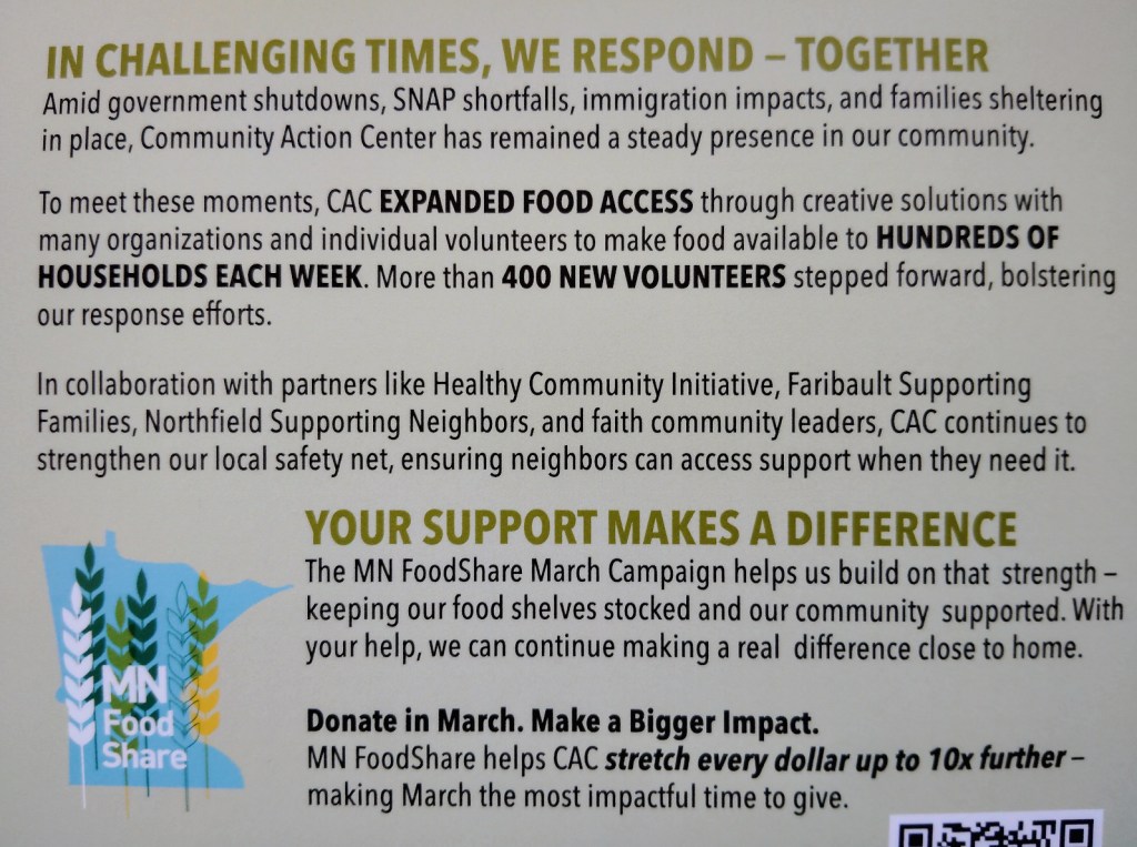 This shows a portion of a promo I received in the mail this week from the Community Action Center with locations in Faribault and in Northfield.