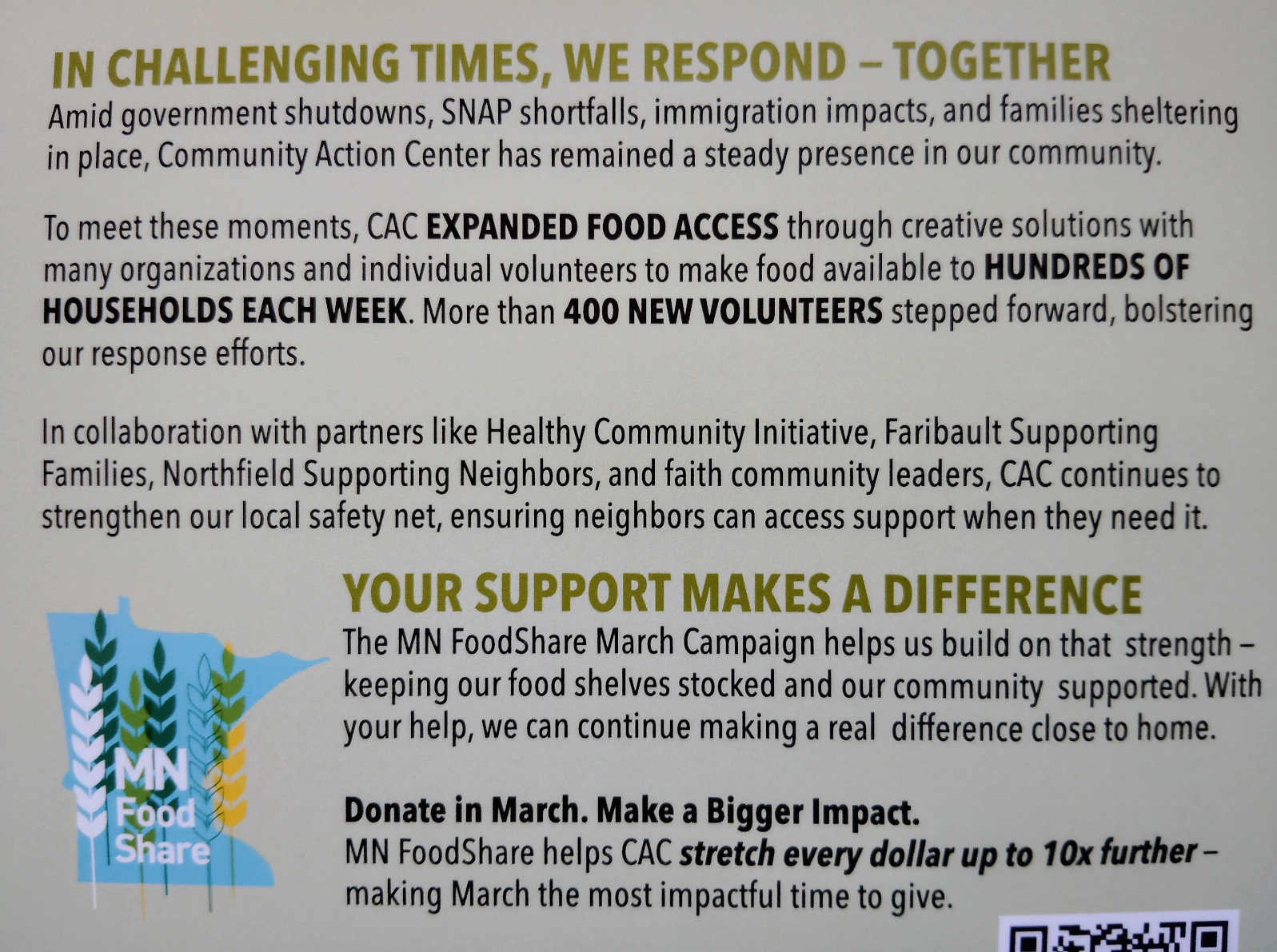 Faribault Community Action Center. Donate to the CAC Community Response Fund which meets urgent and evolving needs such as for food and rent. Please designate your gift for the FARIBAULT CAC as one exists in neighboring Northfield. That town’s council approved a $50,000 request for emergency rental assistance.