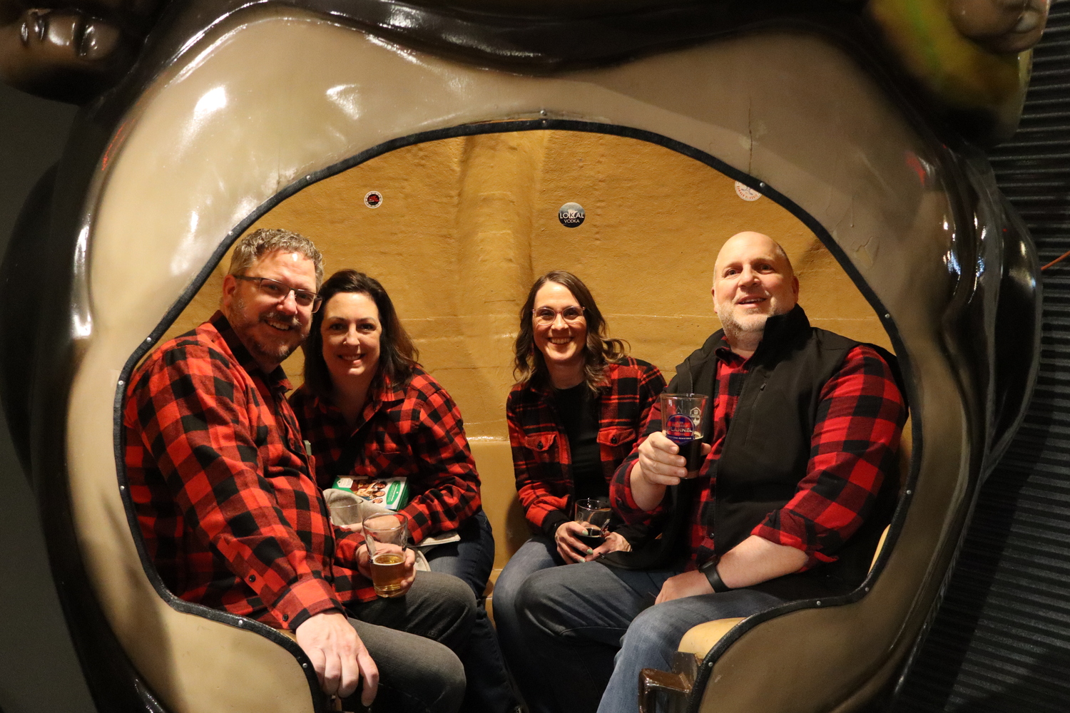 Attendees at a past Faribault Flannel Formal cozy inside a non-working amusement ride inside Corks & Pints. (Photo credit: Faribault Area Chamber of Commerce & Tourism)