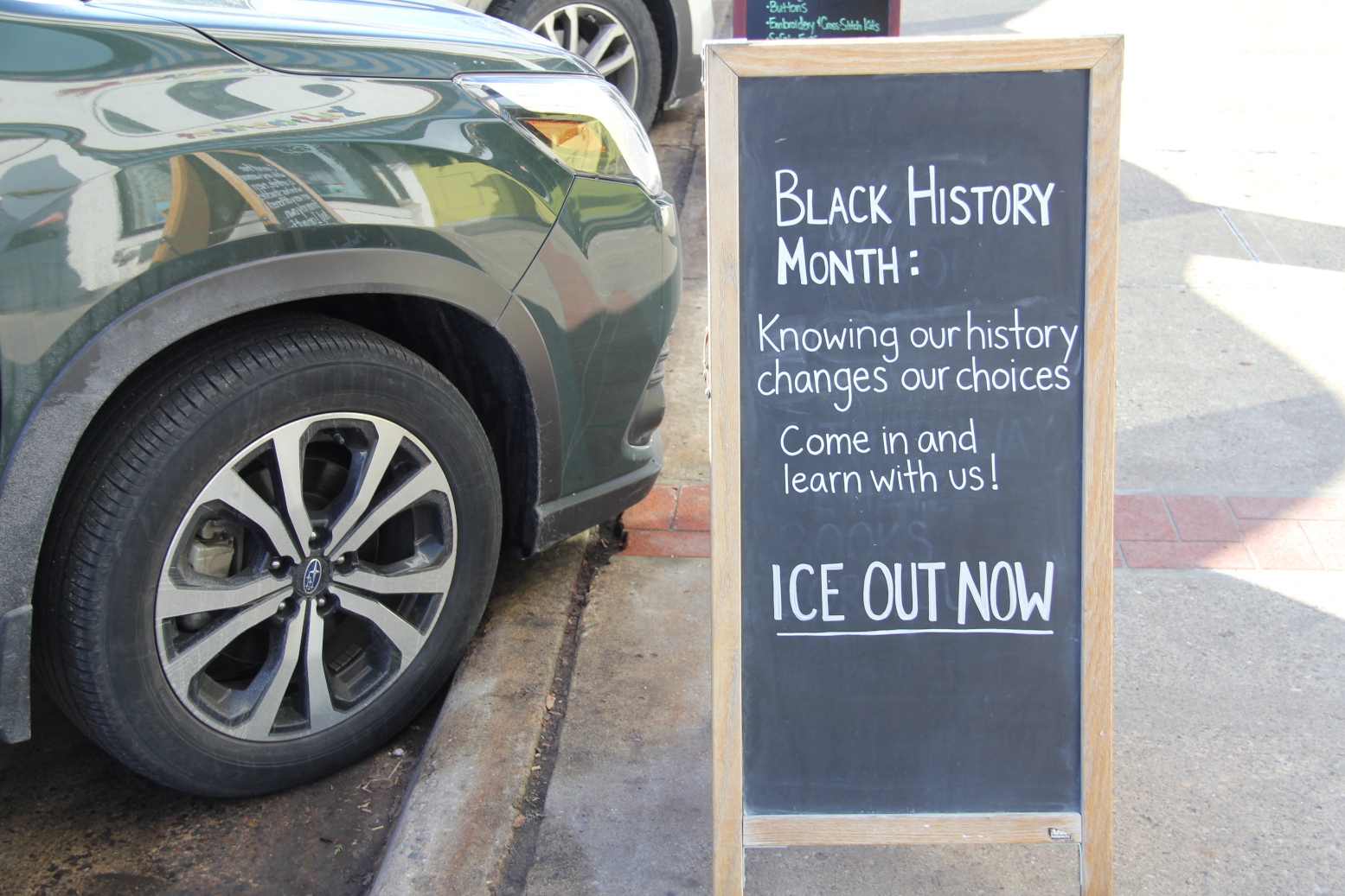 I photographed this sandwich board outside Content Bookstore in mid-February. (Minnesota Prairie Roots copyrighted photo February 2026)