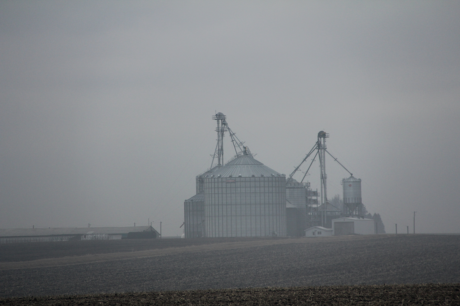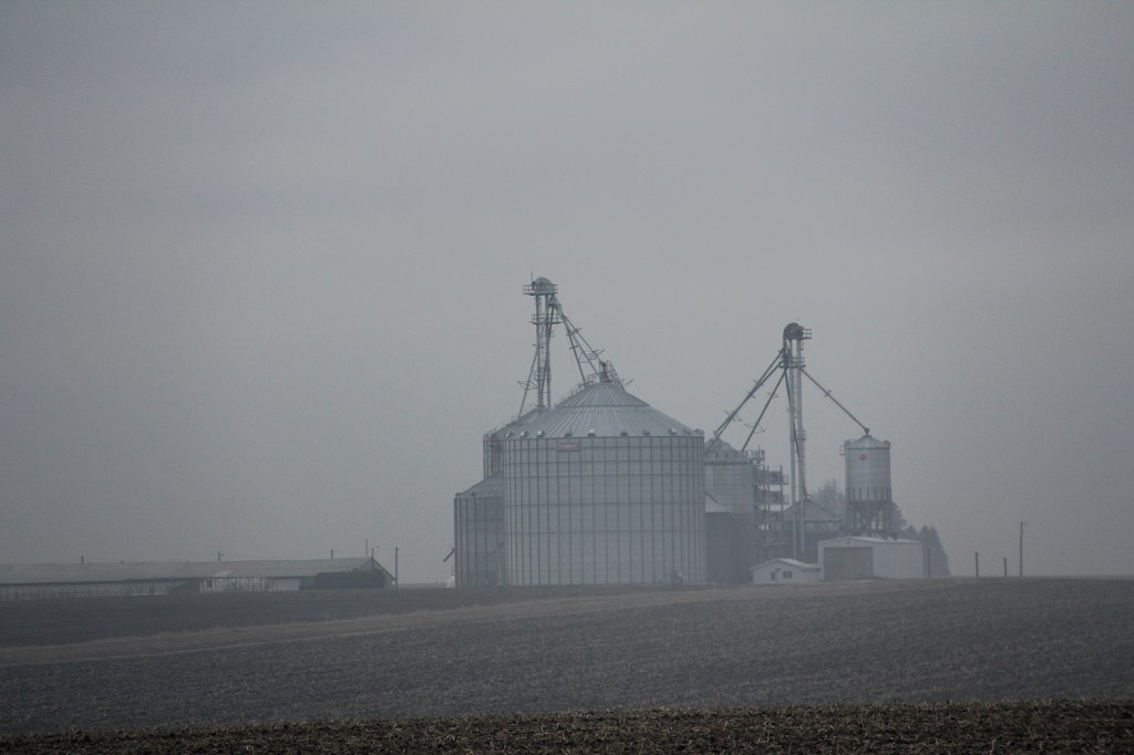 Fog shrouds bins and a grain drying complex along US Highway 14 west of Rochester. (Minnesota Prairie Roots copyrighted photo March 2026)