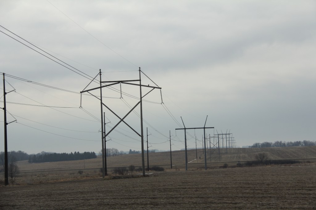 Massive power lines stretch seemingly into infinity along US Highway 14 somewhere between Owatonna and Rochester. (Minnesota Prairie Roots copyrighted photo March 2026)