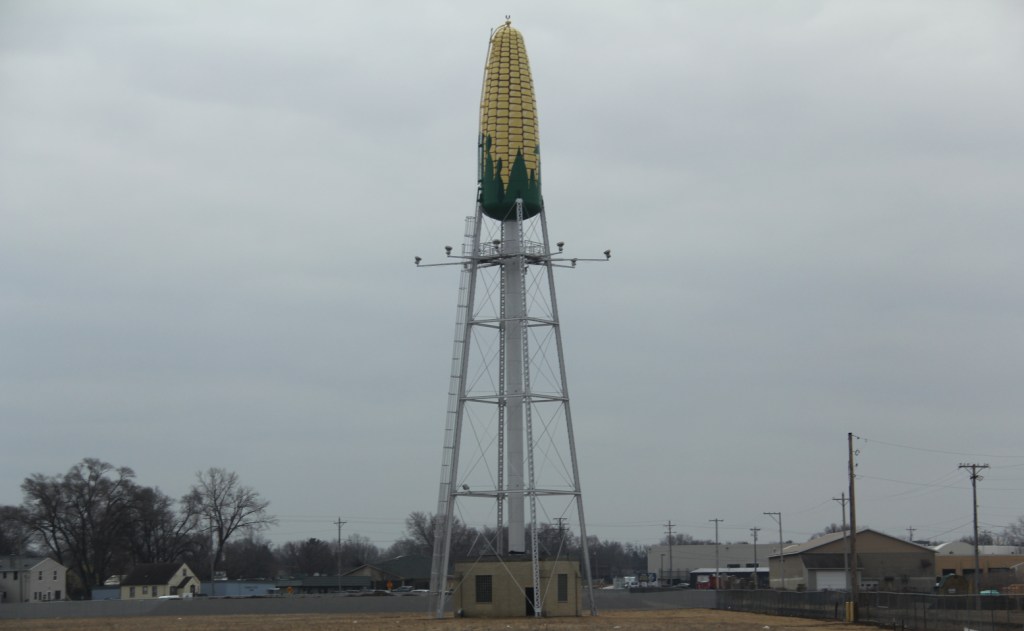 Once in Rochester, color popped at me from a roadside attraction, the 151-foot tall Ear of Corn Water Tower built in 1931 for Reid, Murdoch & Co. The food cannery used the 50,000 gallon water tower in its canning operation, which included canning corn. The business changed hands twice before the plant closed in 2018. But the water tower landmark remains. I found it definitely photo-worthy as we passed by.