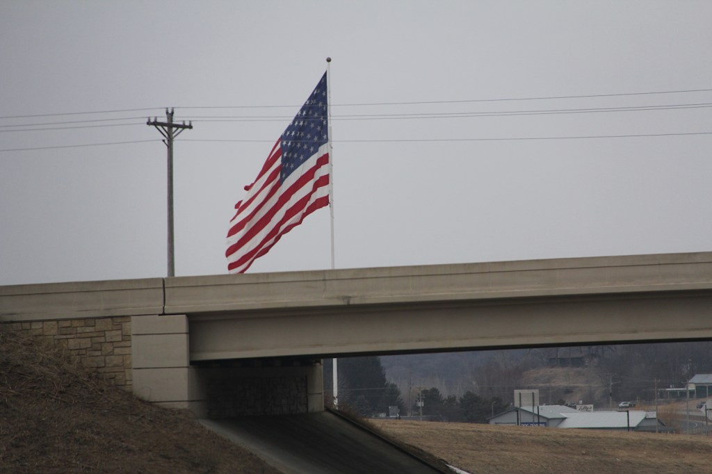 An American flag as photographed along US Highway 52 in Rochester. (Minnesota Prairie Roots copyrighted photo March 2026)