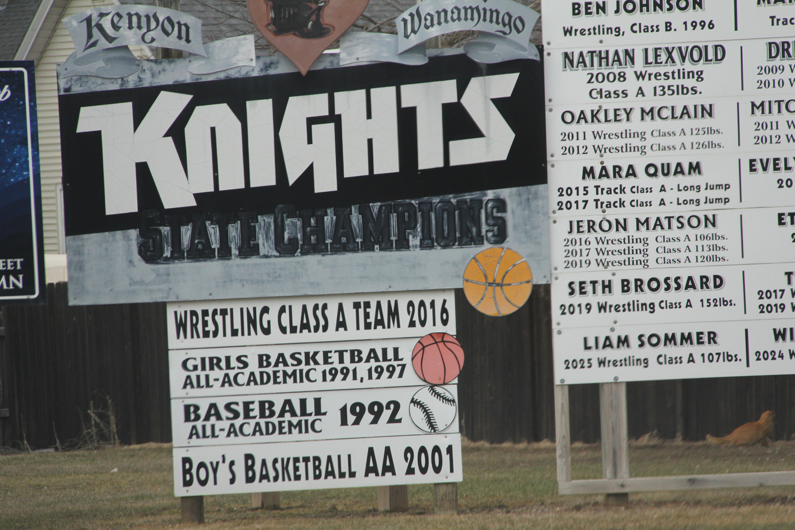 Kenyon-Wanamingo High School sporting accomplishments banner signs. (Minnesota Prairie Roots copyrighted photo March 2026)