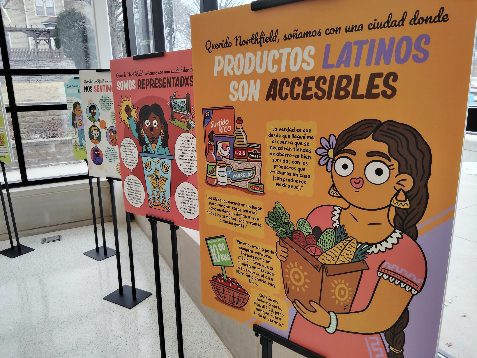The results are colorful, eye-catching panels that reveal invaluable insights from Northfield’s Latino population. I recently saw six of Aguirre’s art posters displayed in the atrium of the Northfield Public Library, a community gathering spot.