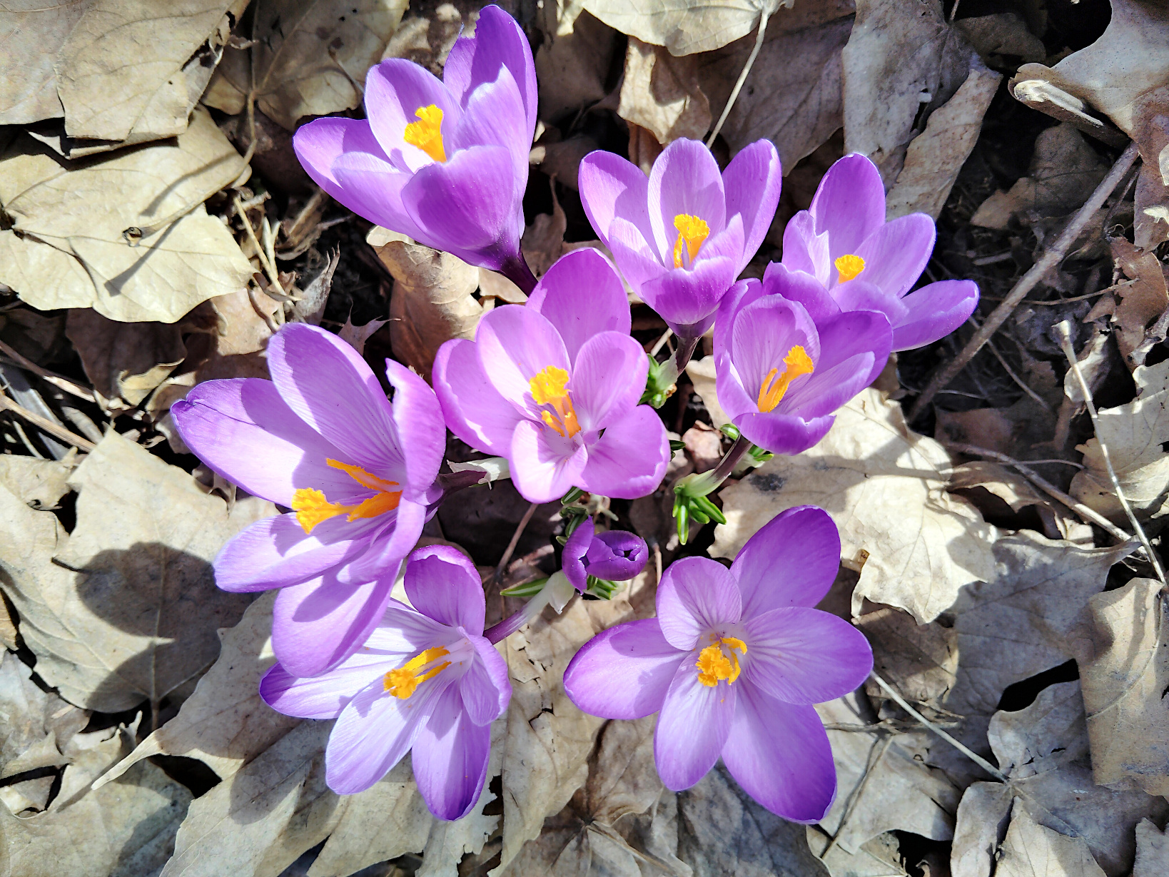 Days after I removed the leaves, exposing the crocuses to sunshine and air, they grew quickly. Soon purple blossoms spread wide, revealing golden centers like spots of sunshine.