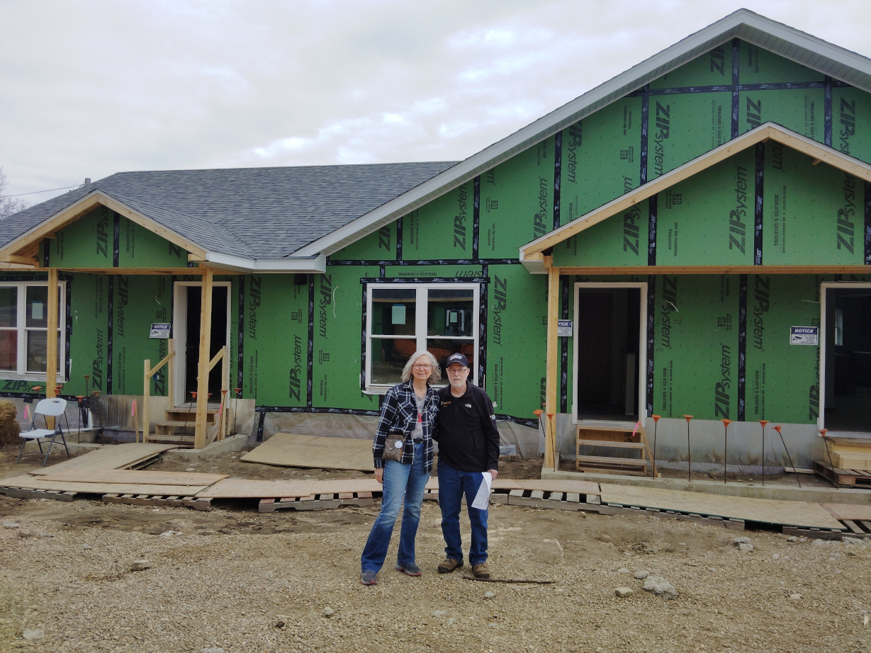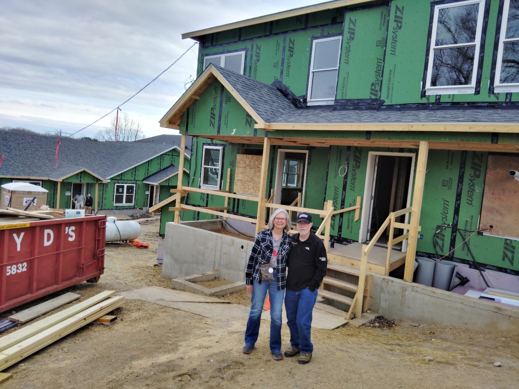 Randy and I stand in front of the larger of two Ridgeview Heights apartments under construction in Faribault. The east apartment building is in the background. (Minnesota Prairie Roots copyrighted photo by Anika Rychner, April 2026)