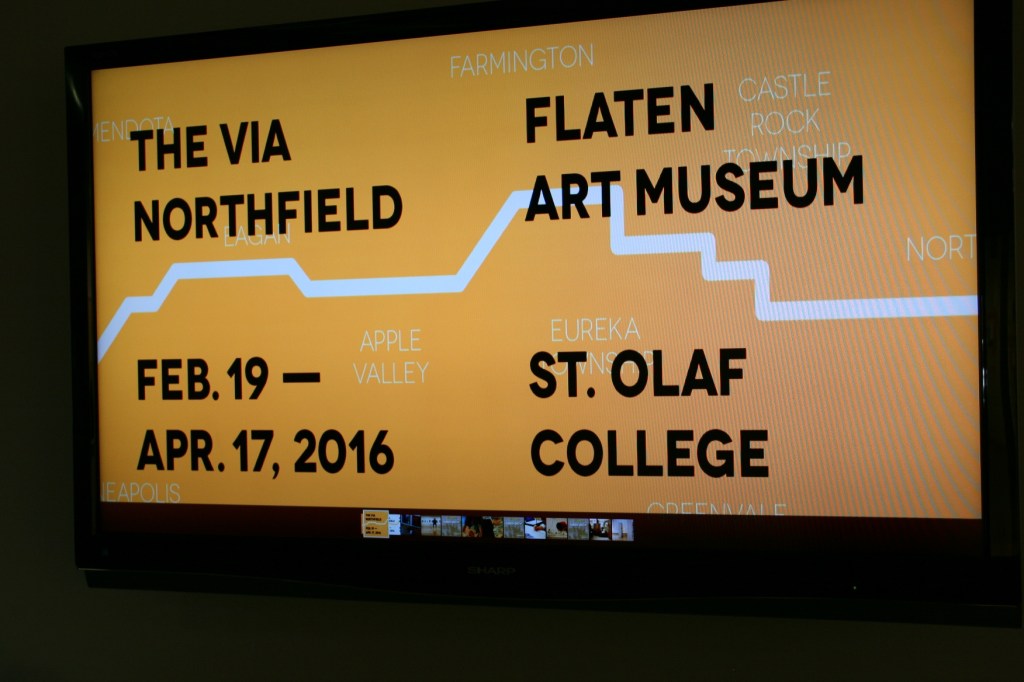 The exhibit is promoted on a screen outside The Flaten Art Museum.