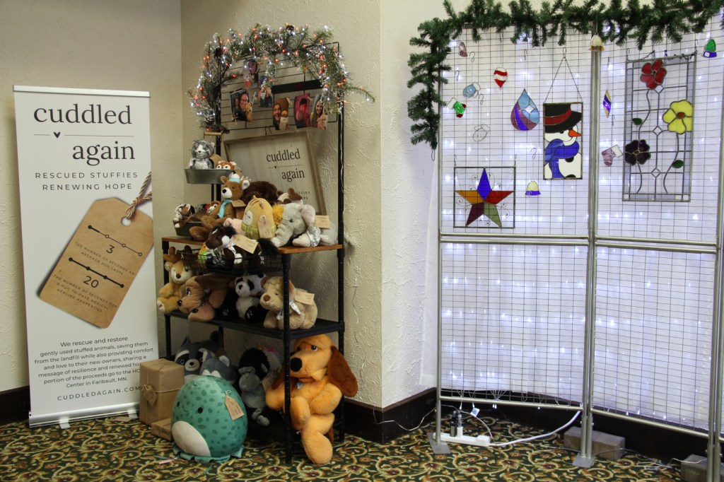 Laura O’Connor of Cuddled Again rescues and restores gently-used stuffies for resale. A portion of the proceeds go to HOPE Center in Faribault. To the right is Sandra Sargent’s stained glass art created at Bending Sunlight Glassworks. She teaches at the Paradise and also has a studio across the street in the Bachrach building. (Minnesota Prairie Roots copyrighted photo December 2025)