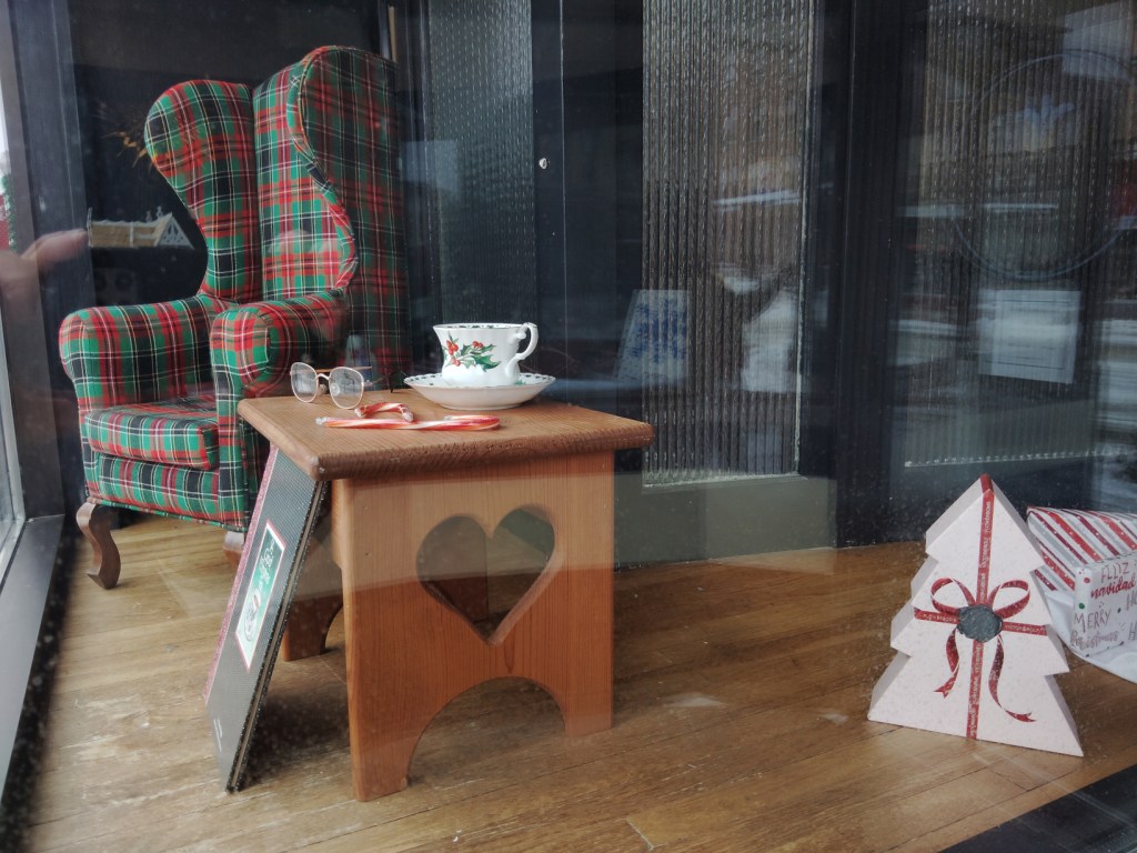 But I found my favorite display, featuring Buddy the Elf, at The Oasis Cafe. A personal story drew me to stand in front of the window with a Buddy cut-out hovering over a plate of spaghetti and assorted candy, candy canes, candy corn and syrup. This, if you’ve seen the movie “Elf,” denotes Buddy’s definition of the four basic food groups. My son loved the “Elf” film so much that I gifted him with syrup and candy corn one Christmas because, why not have a little fun with a nine-year-old? Now, all these years later, I photographed The Oasis “Elf” scene and texted it to my son, who is all grown up and living in Boston.