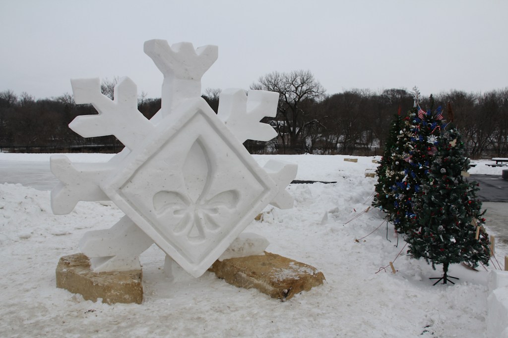 Shattuck-St. Mary’s School students sculpted this snowflake, with the city’s signature Fleur de Lis symbol, for the recent Winterfest. It’s next to the ice rink and has proven a popular photo op backdrop. (Minnesota Prairie Roots copyrighted photo December 2025)