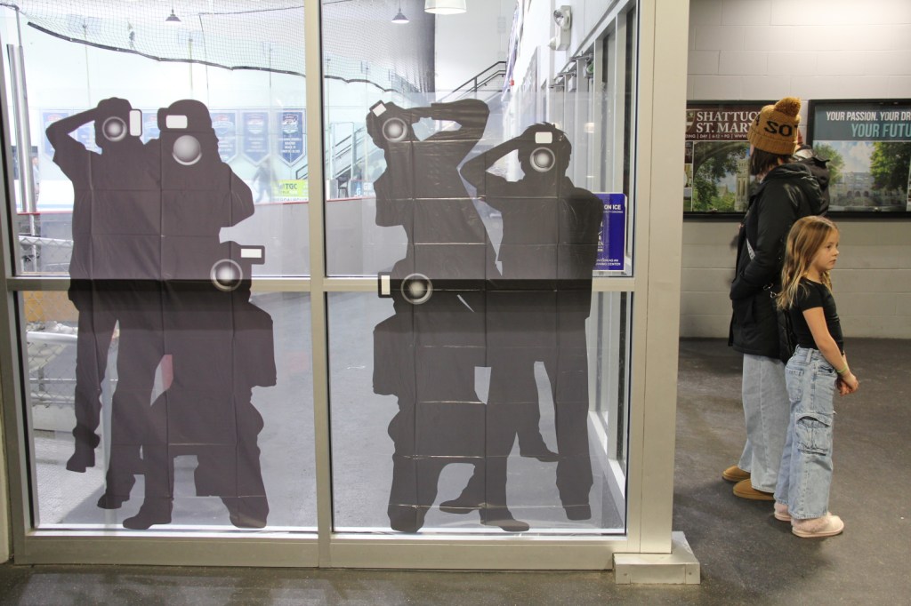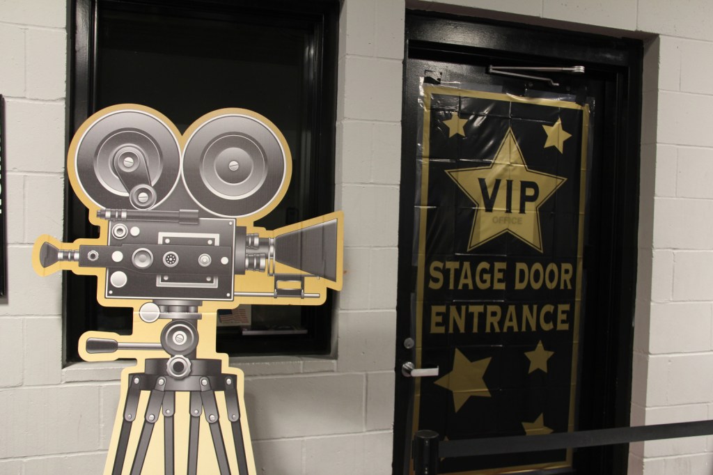 Art on an ice arena window fits the red carpet movie theme of the figure skating show. (Minnesota Prairie Roots copyrighted photo December 2025)