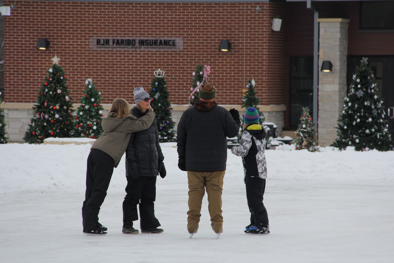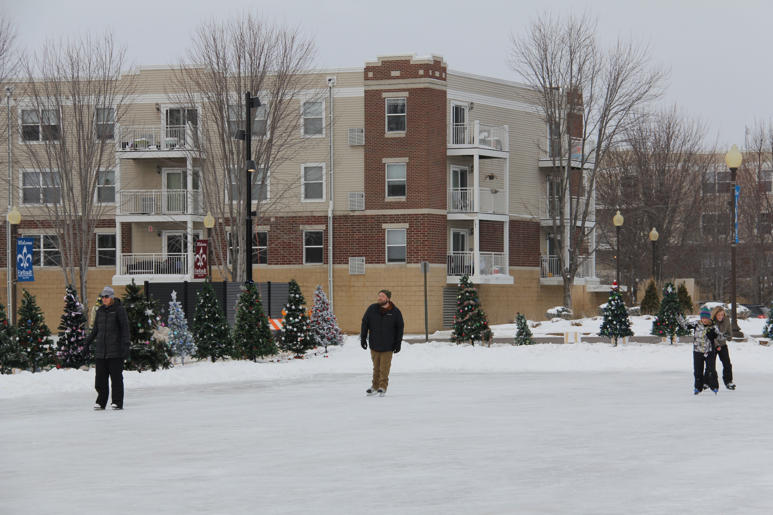 Skating at Viaduct Park in the heart of downtown Faribault with Heritage Bluff Apartments and Christmas trees from the Adopt-a-Tree program in the background. (Minnesota Prairie Roots copyrighted photo December 2025)