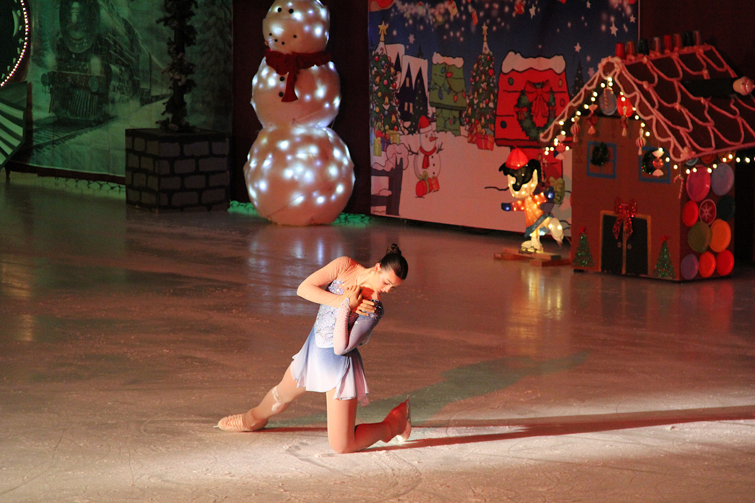AGAINST A FESTIVE BACKDROP of The Polar Express locomotive, a gingerbread house, Frosty the Snowman, a Christmas tree and more, figure skaters at Shattuck-St. Mary’s School performed their annual holiday show on ice, “Lights, Camera, Skates! Christmas at the Cinema,” before an appreciative audience on December 13. And I was there, as I have been for many past figure skating shows that are as much an opportunity for skaters to perform as an early Christmas gift to the community.