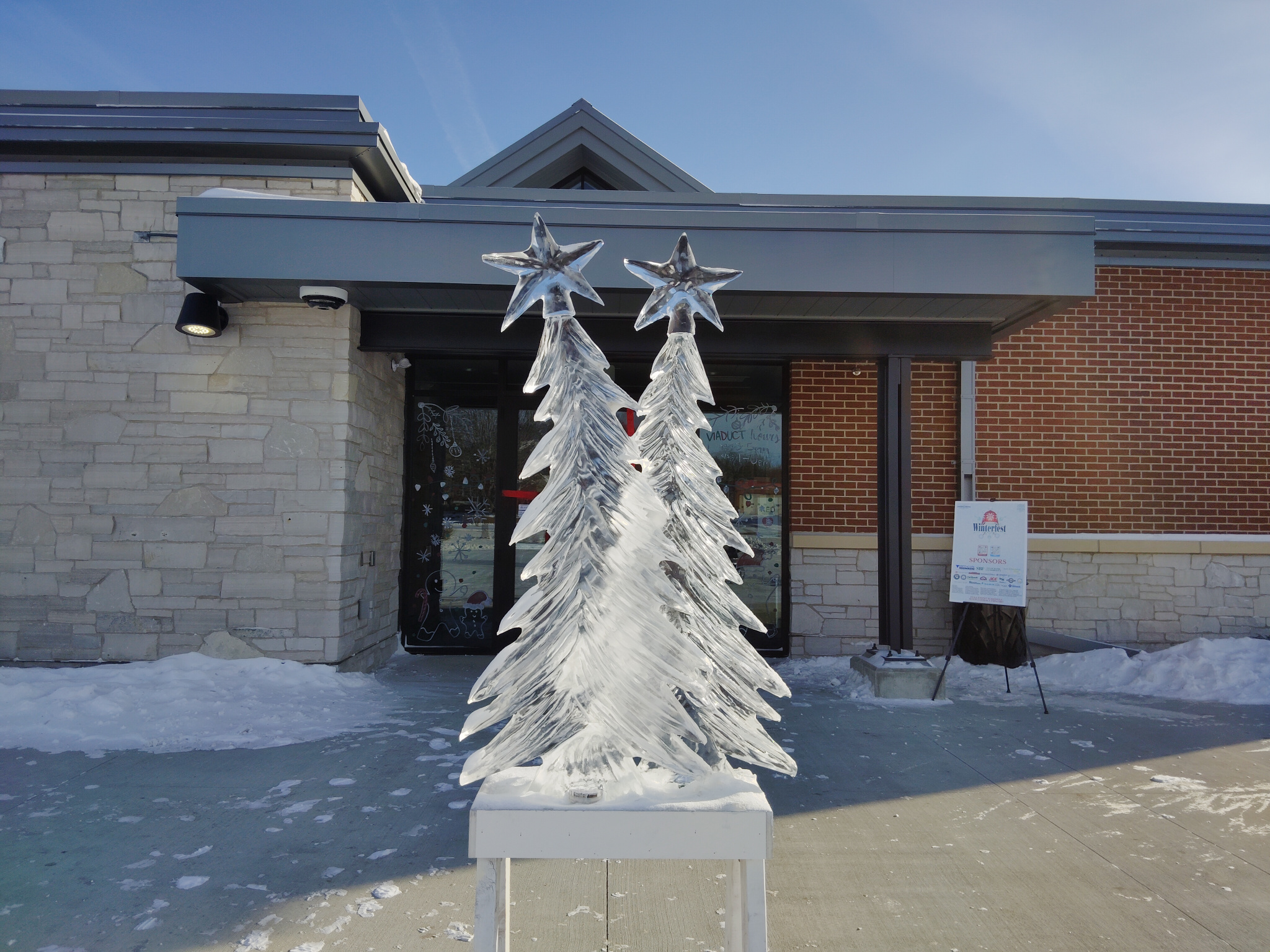 An ice sculpture, crafted for the recent Winterfest, stands outside the entrance to the Viaduct Park community space. The Park also features a splash pad, fire pit and eventually will have a refrigerated skating loop. (Minnesota Prairie Roots copyrighted photo December 2025)