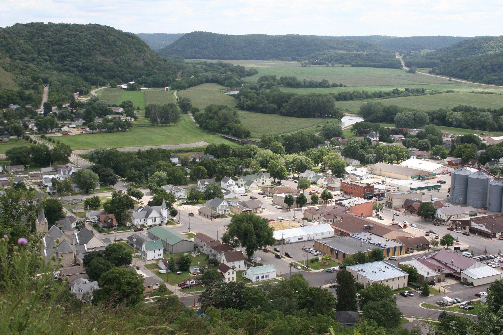 A view of Rushford and the surrounding countryside in southeastern Minnesota, August 2011 Minnesota Prairie Roots file photo.