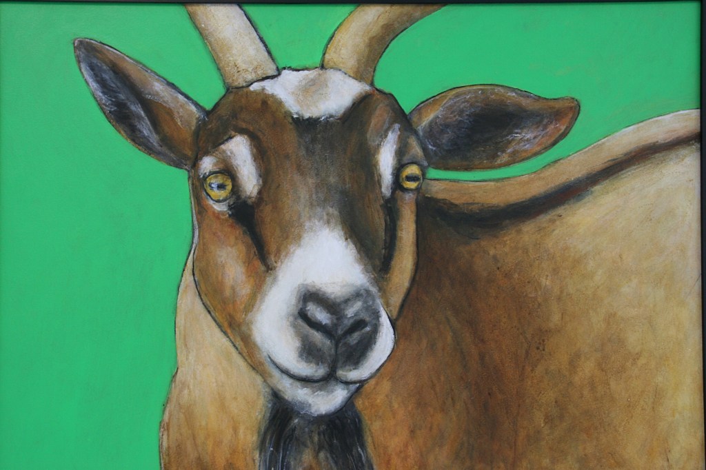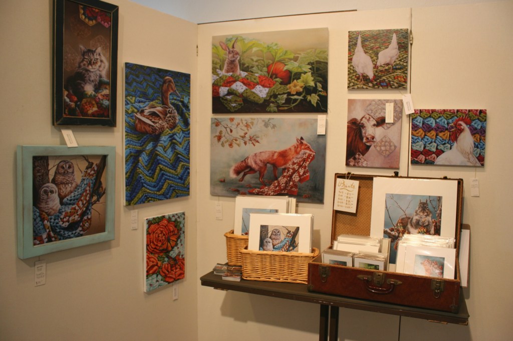 Fakler shows her love for animals in vivid animal portraits done in acrylic and clay. Her art is signature recognizable to me. I’ve often thought Fakler’s colorful animals would be perfect in a children’s picture book or splashed upon a tee shirt. They always make me feel happy.