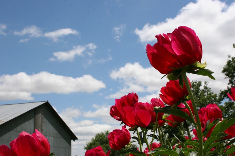 WIND WHIPPED THOUSANDS of past their prime peonies, their crimson, pink and white blossoms dipping, dancing to the rhythm of summer.