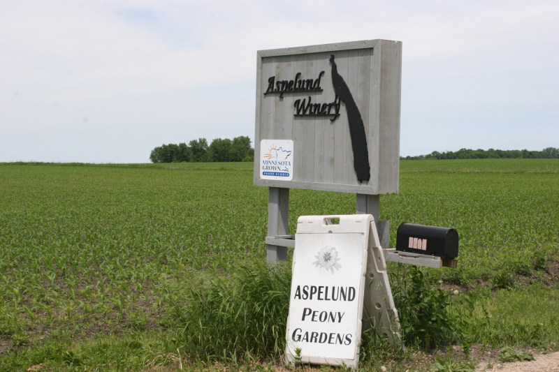 This sign along the gravel road marks Aspelund Peony Gardens & Winery.