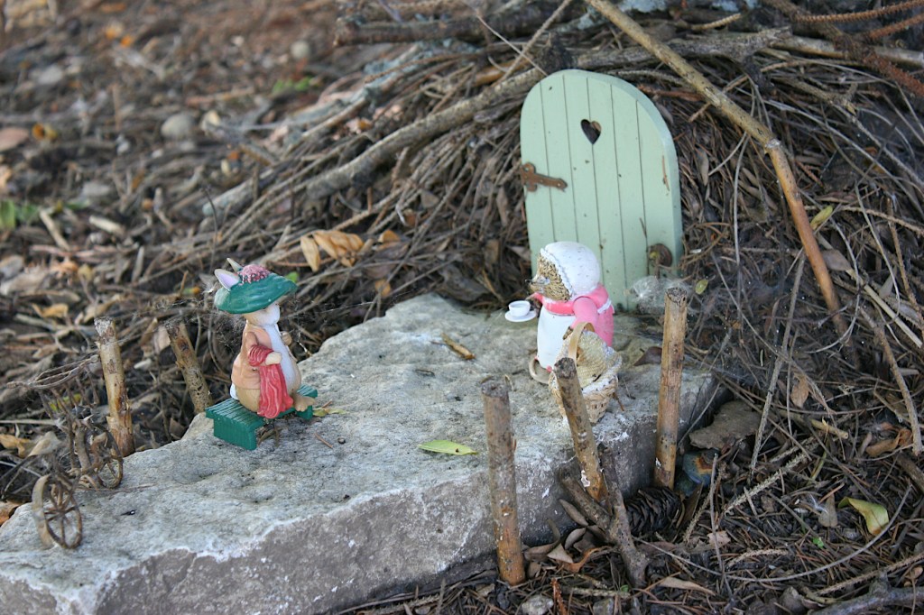 While taking in the nuances of the neighborhood, I discovered a sweet surprise in one yard. Mini garden art. Tiny scenes created with miniature figurines. Mostly rabbits. The unexpected find made me giddy.